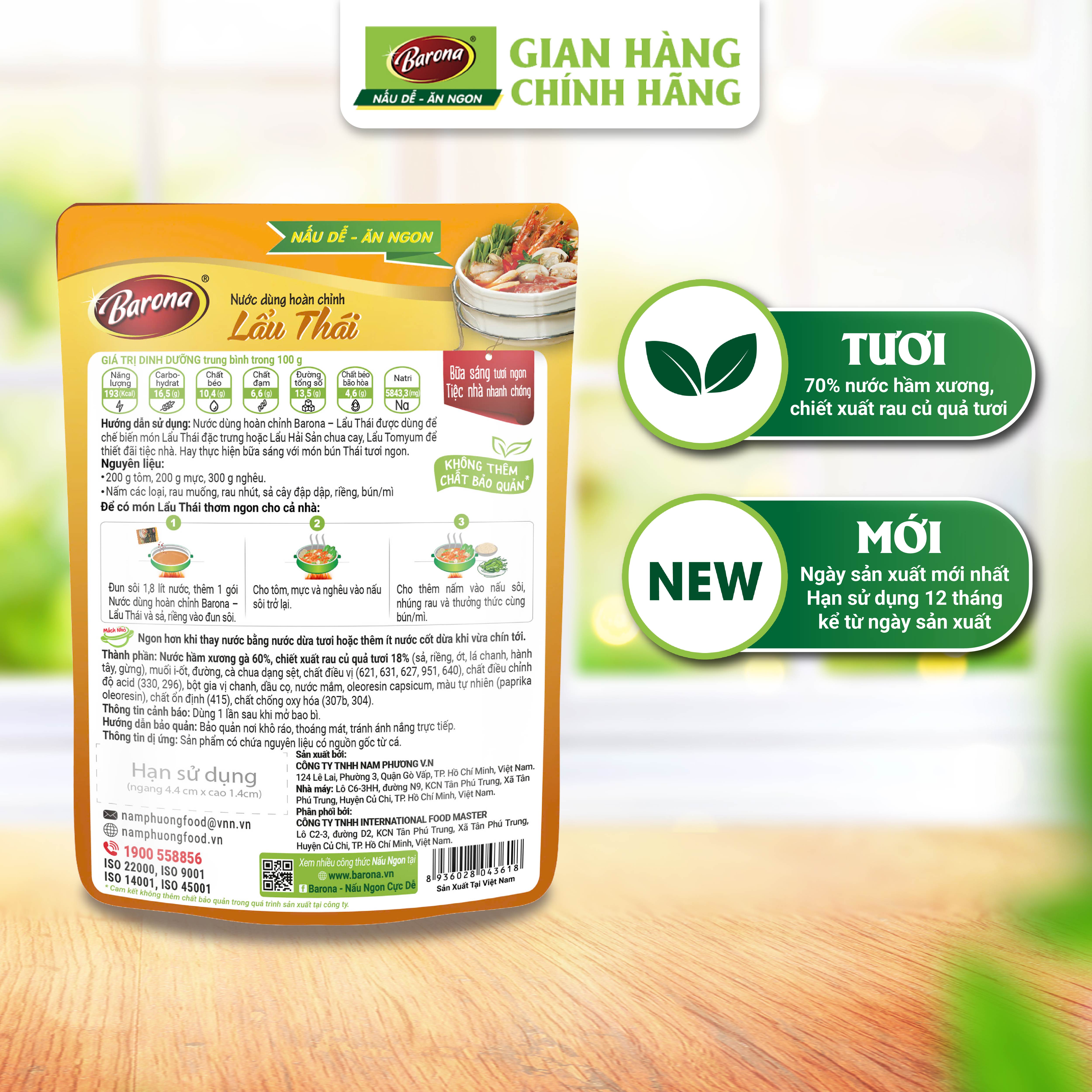 Nước dùng hoàn chỉnh Barona - Lẩu Thái , Tươi Ngon Tự Nhiên với hơn 70% thành phần Nước hầm xương và Chiết xuất Rau củ quả tươi được phối trộn cùng các loại gia vị đặc trưng tạo nên hương vị lẩu Thái chuẩn vị chua chua, cay cay của xứ sở Chùa Vàng khiến bao người mê mẩn. Thực hiện vô cùng nhanh chóng, tiên lợi & hợp vệ sinh, là sự lựa chọn tuyệt vời cho những buổi tiệc tùng của gia đình bạn.