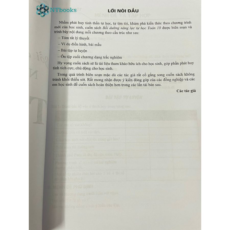 1. Nội dung sách Tự học Toán học lớp 10: Tập 1: - Chương 1: Mệnh đề và tập hợp (5 chủ đề) - Chương 2: Bất phương trình - Hệ bất phương trình (4