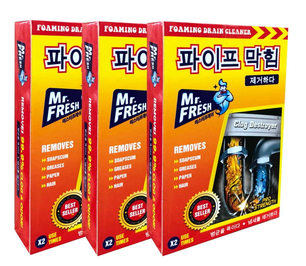 Bột thông tắc đường ống thoát nước Mr.Fresh Hàn Quốc là một trong những sản phẩm tốt nhất được bán chạy ở Hàn Quốc với công thức tiên tiến, các thành phần hóa học chuyên dụng, độ tẩy cực mạnh sẽ xoáy tan mọi cặn bẩn trong đường ống một cách hiệu quả.Sản phẩm sẽ thông sạch mọi loại cặn bẩn như giấy, rác, rau, mỡ, thịt, gạo, tóc… kẹt trong đường ống thoát nước của chậu rửa nhà bếp, lavabo, bồn tắm… mà không làm hư hại đường ống và các thiết bị vệ sinh.Bột thông tắc đường ống thoát nước Mr.Fresh Hàn Quốc trong thành phần của nó luôn có các hỗn hợp hóa học có độ kiềm, độ ăn mòn, độ phân hủy cực cao, giúp phân hủy các hợp chất hữu cơ, chất cặn bã có trong đường ống gây tắc nghẽn.