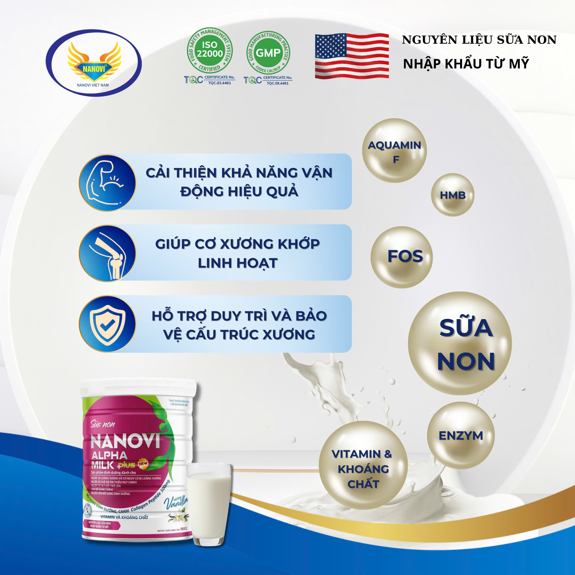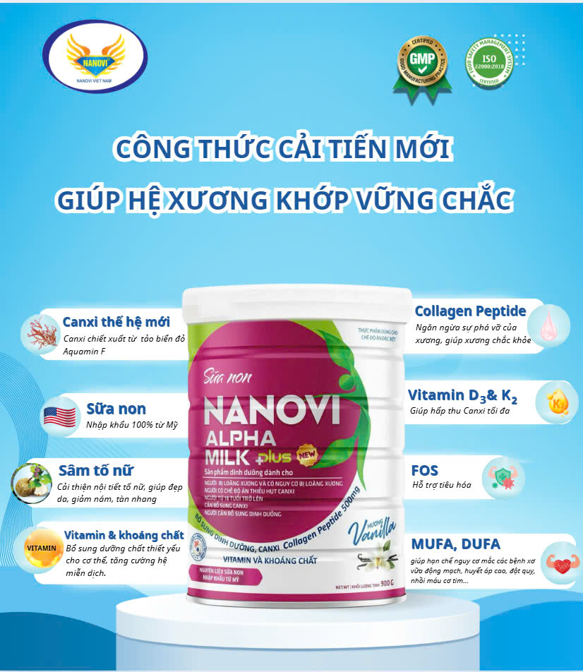 Sữa Non NANOVI ALPHA MILK PLUS bổ sung 50 vitamin và khoáng chất giúp cung cấp năng lượng cần thiết cho cơ thể, hỗ trợ hấp thu Canxi giúp hệ xương chắc khỏe, cùng với sự kết hợp độc đáo của chất xơ FOS giúp cải thiện hệ tiêu hóa- CUNG CẤP NĂNG LƯỢNG CẦN THIẾT CHO CƠ THỂ, DƯỠNG CHẤT ĐỦ ĐẦY CHO GIẤC NGỦ THÊM NGON.