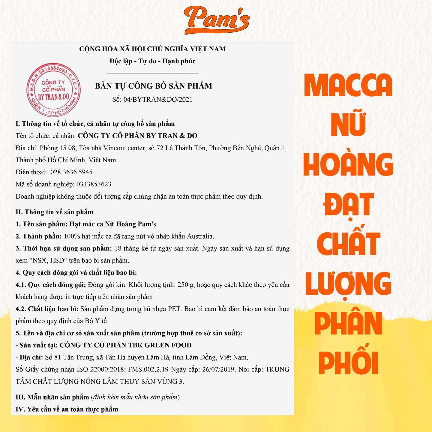 - Hạt Macca Pam's được nhập khẩu chính ngạch và chế biến, đóng gói theo qui trình khép kín chuẩn ISO22000 tại Việt Nam. Hạt Macca thành phẩm đạt chất lượng cao nhất, thơm ngon, bảo toàn các chất dinh dưỡng và khoáng chất trong hạt.