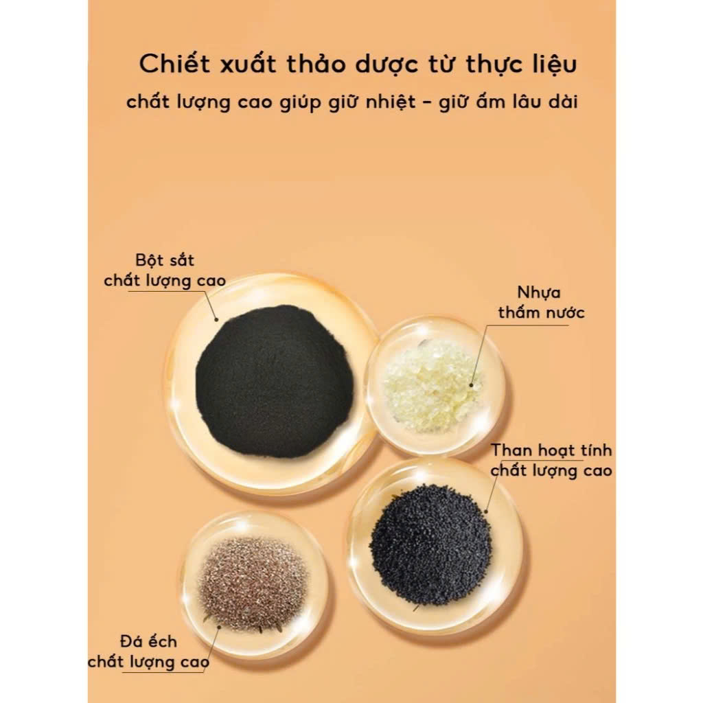 - Thành phần: Bột sắt chất lượng cao, nhựa thấm nước chất lượng cao, đá ếch chất lượng cao, than hoạt tính, tinh chất thảo dược ngải cứu ...