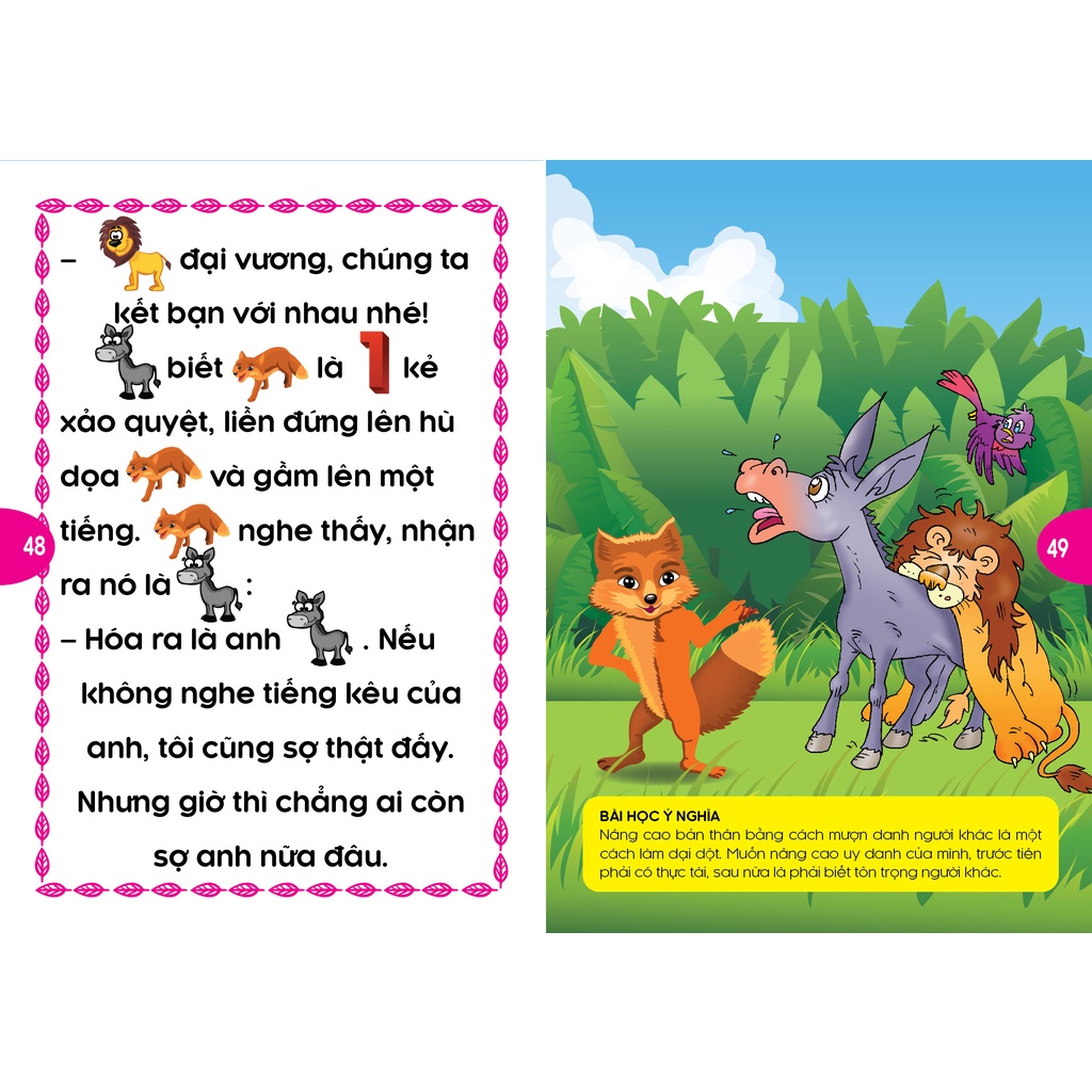 đọc truyện theo tư duy hình ảnh ,mỗi câu chuyện kết hợp với hình ảnh thay cho từ để bé đoán hình thành câu chuyện đọc hay cho bé. Đặc biệt cuối mỗi câu chuyện là Lời bàn ngắn gọn, dễ hiểu và mang tính gợi mở để các bé hiểu và tự suy nghĩ, rút ra bài học cho chính bản thân của bé Thông qua những mẫu truyện ngụ ngôn có một sức lôi cuốn mãnh liệt với trẻ nhỏ, đặc biệt là trong những năm tháng đầu đời và cha mẹ có thể dạy bé nhiều bài học bổ ích về cuộc sống trong quyển sách này, hỗ trợ phát triển rèn luyện tư duy logic, năng lực ngôn ngữ và hình thành các giá trị đạo đức cơ bản nhất từ rất sớm. Điều này thực sự sẽ xây dựng một nền tảng vững vàng cho sự trưởng thành của bé. Mời bạn tham khảo một số truyện ngụ ngôn