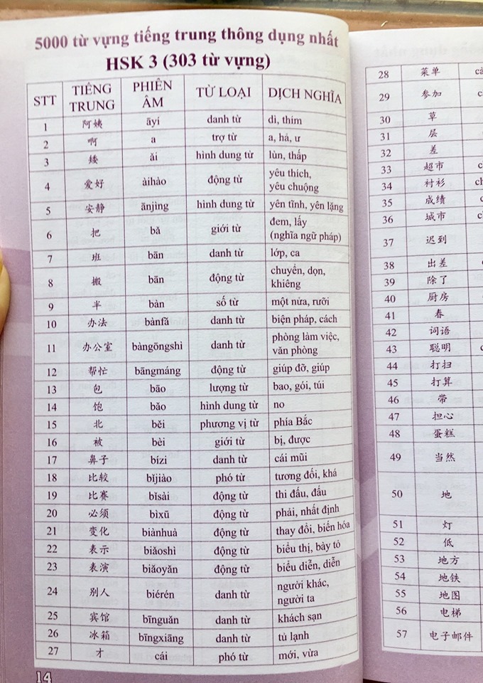 Mua tại Tiktok- 5000 từ vựng tiếng Trung thông dụng nhất Nội dung sách: “Sách – 5000 từ vựng tiếng Trung thông dụng nhất” theo khung đề thi từ HSK1 – 6 cung cấp đầy đủ lượng từ vựng cần thiết giúp việc học từ vựng tiện lợi và hiệu quả hơn, đồng thời hỗ trợ cho việc thi các cấp độ HSK từ 1 đến 6 Tác giả: Trần Thị Tú Oanh, Diệu Hồ Số trang: 184 Năm xuất bản: 2019 Nhà xuất bản: Đà Nẵng Chú ý : Nội dung trong sách tổng 5000 từ HSK1 (146 trang 4) HSK2(149 Trang 9) HSK3(303 từ trang 14) HSK4(606 từ trang 24) HSK5 (1296 từ trang 45) HSK6(2500 từ trang 88) Nhằm đáp ứng nhu cầu học từ vựng của bạn đọc, chúng tôi xin giới thiệu cuốn sách 5000 từ vựng tiếng Trung – Bí kíp chinh phục từ vựng kỳ thi HSK 1 – 6 tổng hợp những từ vựng tếng Trung được sử dụng với tần suất nhiều nhất trong các kỳ thi HSK. Ngoài việc liệt kê những từ vựng thông dụng, chúng tôi còn đưa ra cách phát âm, âm Hán Việt, nghĩa để các bạn có thể hiểu rõ và sử dụng đúng từ vựng vừa học, từ đó giúp các bạn nâng cao vốn từ vựng và nâng cao khả năng tiếng Trung, đặc biệt là đạt kết quả tốt trong các kỳ thi HSK. Để có thể thi được HSK, bạn phải có 1 vốn từ vựng phù hợp. HSK càng cao thì lượng từ vựng cũng càng yêu cầu mở rộng hơn. Cụ thể: Hán ngữ 1: học hết lượng từ vựng trong giáo trình hán ngữ 1 (150 từ). Hán ngữ 2: học hết lượng từ vựng trong giáo trình hán ngữ 1+2 (300 từ). Hán ngữ 3: học hết lượng từ vựng trong giáo trình hán ngữ 1+2+3 (600 từ). Hán ngữ 4: học hết lượng từ vựng trong giáo trình hán ngữ 1+2+3+4 (1200 từ). Hán ngữ 5: học hết lượng từ vựng trong giáo trình hán ngữ 1+2+3+4+5 (2500 từ). Hán ngữ 6: học hết lượng từ vựng trong giáo trình hán ngữ 1+2+3+4+5+6 (5000 từ).