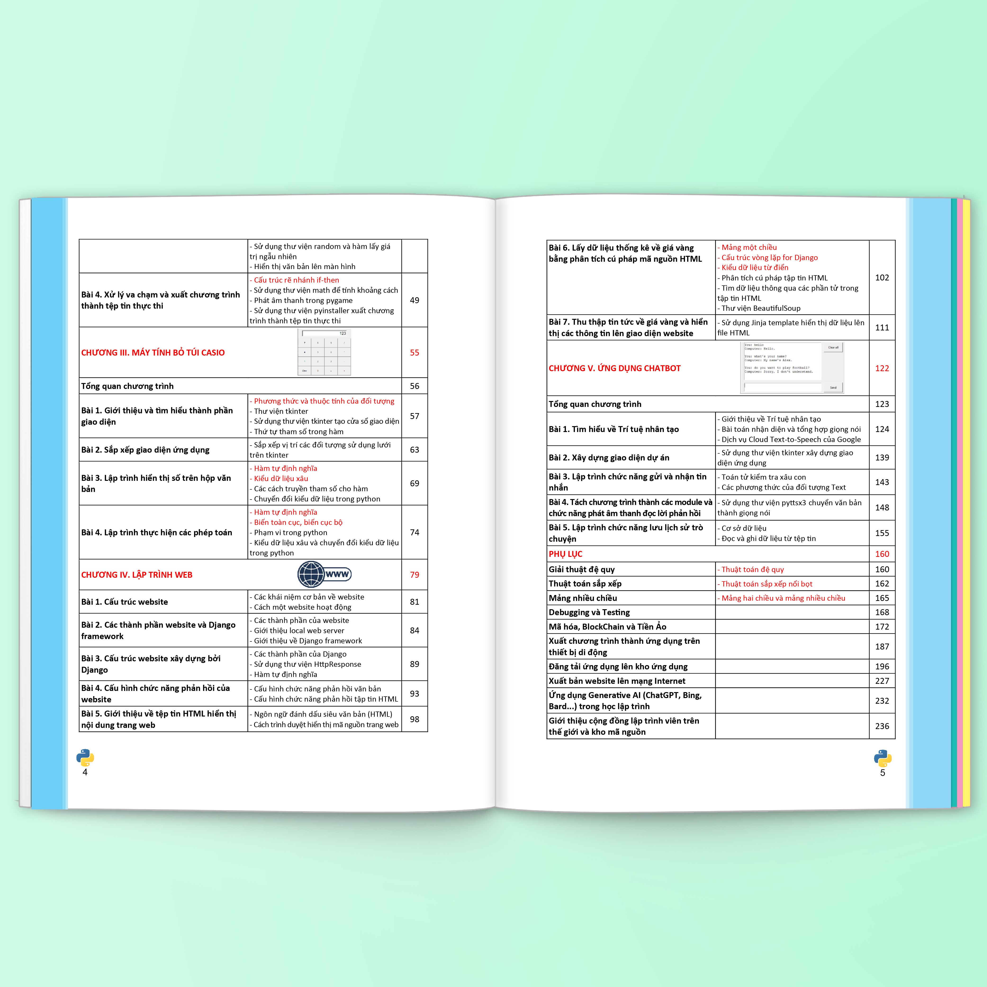 Ngoài ra, phần phụ lục sẽ hướng dẫn các bạn cách tìm và sửa lỗi sai trong chương trình; Cách sử dụng trí tuệ nhân tạo chatbot trong học lập trình; Giới thiệu cộng đồng lập trình viên trên thế giới; Giới thiệu về mã hóa, công nghệ blockchain và tiền ảo; Giới thiệu thêm một số đối tượng trong thư viện Kivy; Hướng dẫn cách đăng tải ứng dụng lên chợ ứng dụng.
