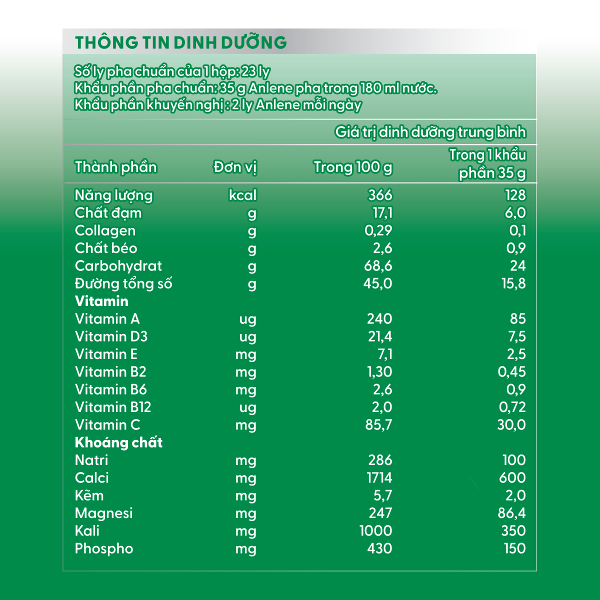 SỮA ANLENE HƯƠNG VANI Sản phẩm sữa dành cho người từ 30 tuổi trở lên Hệ Dưỡng Chất BoneMax Chứa hàm lượng cao: Đạm, Canxi, Collagen Vitamin: B, C, D Khoáng chất: Magiê, Kẽm Cung cấp dinh dưỡng nền tảng, giúp duy trì sức khỏe hệ vận động, hỗ trợ Cơ - Xương - Khớp khỏe mạnh & linh hoạt. 03 LỢI ÍCH VƯỢT TRỘI TRONG MỖI LY ANLENE CƠ KHỎE Chứa: Đạm, Magiê, Vitamin B, Vitamin D Vai trò: Duy trì mật độ cơ, giúp vận động nhanh nhẹn và linh hoạt XƯƠNG CHẮC Chứa: Canxi, Vitamin D, Magiê, Kẽm Vai trò: Duy trì mật độ xương, nâng đỡ cơ thể vững chắc KHỚP LINH HOẠT Chứa: Vitamin C Vai trò: Hỗ trợ hình thành collagen, nuôi dưỡng sụn khớp, tăng khả năng vận động linh hoạt HƯỚNG DẪN SỬ DỤNG Pha 04 muỗng sữa Anlene (khoảng 35g) vào 200ml nước chín Nên pha với nước ấm để ngon hơn Người lần đầu uống sữa nên: Uống sau bữa ăn Bắt đầu từ 50ml rồi tăng dần lên 200ml trong 2 tuần để tránh không dung nạp lactose   KHUYẾN NGHỊ SỬ DỤNG Uống 2 ly sữa Anlene mỗi ngày️ Thoải mái vận động và làm điều mình yêu thích!   THÔNG TIN BỔ SUNG Khuyến nghị bởi Hội Loãng Xương Quốc Tế Hiệu quả sau 4 tuần: Hỗ trợ xương chắc, cơ khỏe   LƯU Ý Không sử dụng khi sản phẩm hết hạn Sản phẩm có chứa: Sữa Collagen chiết xuất từ cá Sản phẩm từ đậu nành Hạn sử dụng: 18 tháng Xuất xứ: Malaysia Bao bì: Có thể thay đổi theo từng đợt giao hàng