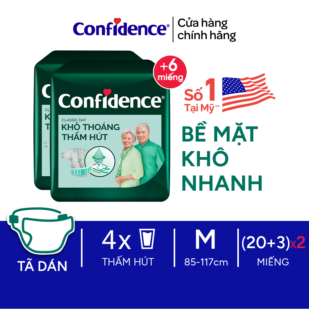 Mua tại TiktokTÃ DÁN CONFIDENCE CLASSIC DAY - SIÊU THOÁNG KHÍ, SIÊU THẤM HÚT - AN TÂM & THOẢI MÁI cho cả gia đình. Sản phẩm tăng cường độ thấm hút và giữ bề mặt tã luôn khô thoáng, là lựa chọn hiệu quả cho người dùng hạn chế khả năng đi lại. ĐẶC ĐIỂM NỔI BẬT