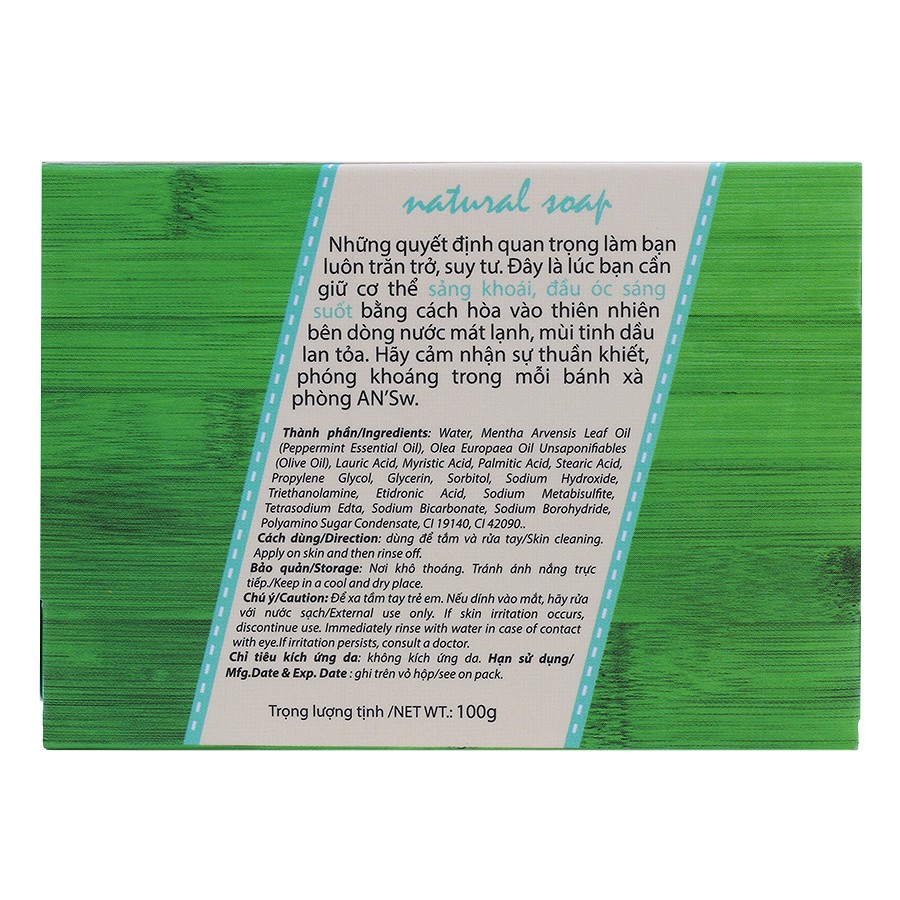 Combo 2 Xà Phòng Thiên nhiên AN'Sw Bạc Hà [Men] Với sự kết hợp giữa tinh dầu Bạc Hà, dầu Olive và Glycerin xà phòng thiên nhiên An’sw giúp làm sạch và không gây khô da, dưỡng da mềm mại. Tinh dầu Bạc Hà the mát, giúp tinh thần thư giãn, sảng khoái dài lâu.