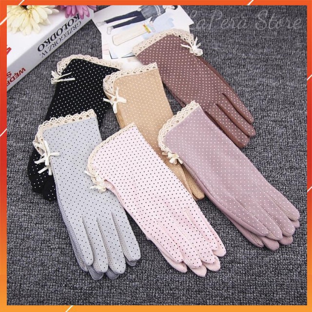 Thông tin Găng tay chống nắng nữ ngắn chấm bi thật tay co giãn thoải mái - Sản phẩm được làm từ chất liệu vải thun, dày vừa phải, thấm mồ hôi, đeo lên tay