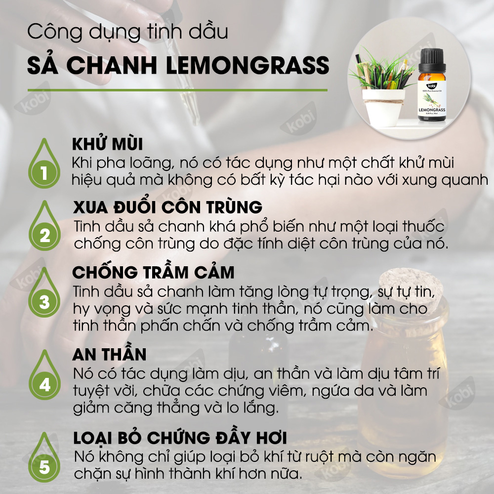 Tinh Dầu Sả Chanh Kobi (5ml) có nhiều tác dụng hỗ trợ trị đau đầu, diệt côn trùng, kích thích, sát trùng được dùng làm thuốc giải cảm, chữa đau bụng, đau dạ dày,