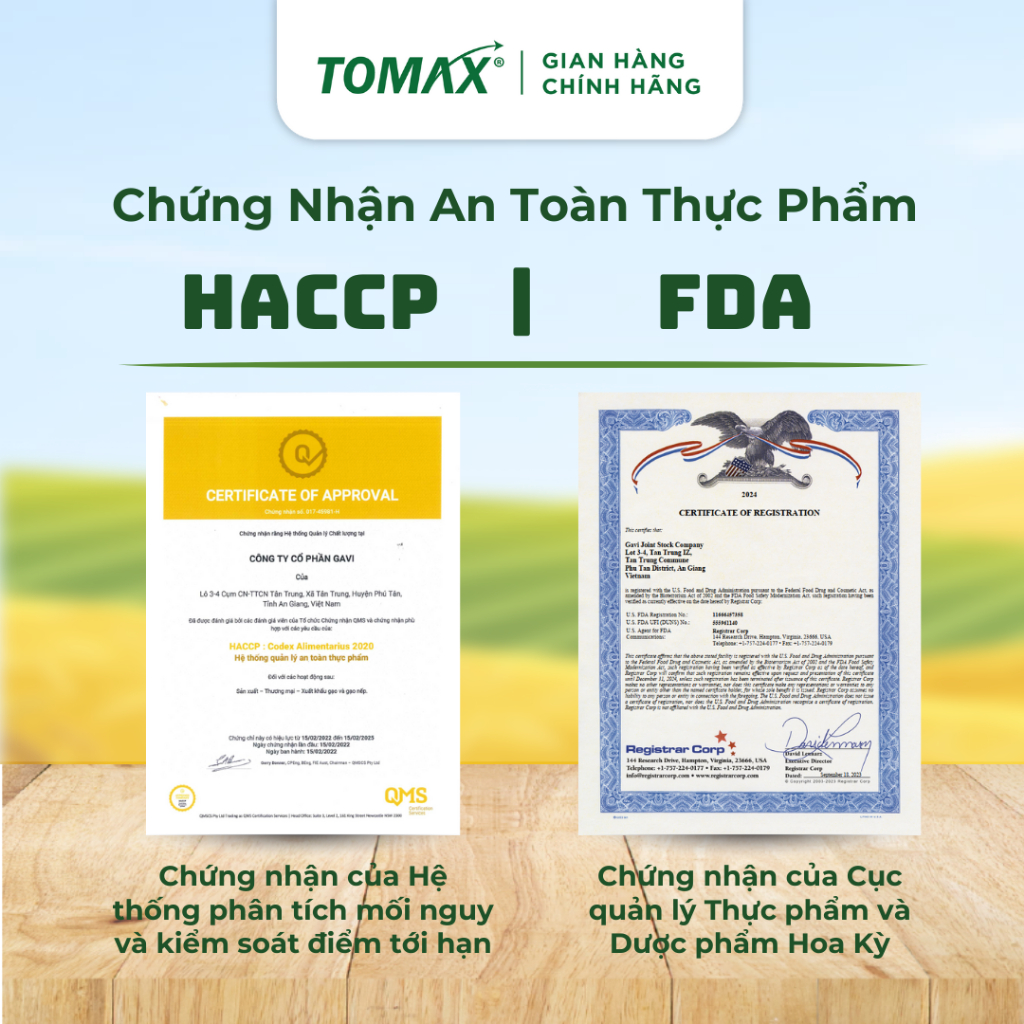 COMBO 3 TÚI 5KG GẠO HỮU CƠ ST25 Tomax THƯỢNG HẠNG, DẺO THƠM - TOMAX Với tâm huyết của một “lão nông tri điền”, ông Trần Văn Mây - Người sáng lập Gavi, đối tác sản xuất của TOMAX Holding đã nghiên cứu và ứng dụng phân bón hữu cơ vi sinh, kiến tạo mô hình nông nghiệp xanh tiêu biểu. Đồng thời tạo ra những sản phẩm an toàn, chất lượng cho người tiêu dùng, đưa giá trị gạo Việt vươn tầm thế giới. Được sản xuất từ 100% chế phẩm sinh học và các loại cây thảo dược có tính chất giải độc, phân bón hữu cơ vi sinh của TOMAX Holding đã nhanh chóng cải thiện chất lượng đất, nâng cao năng suất và chất lượng của cây lúa ngay vụ mùa đầu tiên. Đồng thời, Tomax còn sử dụng giống lúa thuần chủng, quản lý côn trùng và bệnh hại theo phương pháp sinh học, ứng dụng công nghệ thu hoạch, chế biến và đóng gói theo tiêu chuẩn quốc tế để tạo ra những cánh đồng vàng bất tận với chất lượng cao cấp nhất. Việc canh tác theo quy trình khép kín đã giúp Tomax Holding thành công mang đến khách hàng những sản phẩm gạo sạch thượng hạng, trong đó có gạo đặc sản Sóc Trăng ST25 Tomax 100% hữu cơ - Loại gạo giành giải nhất trong cuộc thi "Gạo ngon nhất thế giới" năm 2019 – World’s Best Rice. Giá trị ưu việt của Gạo sạch đặc sản Sóc Trăng ST25 Tomax Được canh tác theo hướng hữu cơ với quy trình khép kín đạt chuẩn, gạo sạch ST25 của Tomax Holding sở hữu những ưu điểm vượt trội: Được chọn lựa kỹ lưỡng, từng hạt gạo ST25 trắng ngần, dài, và có hương thơm tự nhiên đặc trưng, mang đến bữa cơm mềm dẻo, ngọt dịu, giữ trọn vẹn giá trị dinh dưỡng và hương vị tinh tế. Hoàn toàn tự nhiên - Không thuốc bảo vệ thực vật; Không hương liệu nhân tạo; Không chứa chất tạo màu, chất bảo quản; Không chất tẩy trắng, Không GMO đảm bảo an toàn và nâng cao sức khỏe cho người tiêu dùng. Canh tác hữu cơ với tiêu chuẩn an toàn vệ sinh thực phẩm quốc tế HACCP, FDA Chuỗi sản xuất khép kín và đồng nhất (Field - Factory - Food): Dễ dàng truy xuất nguồn gốc và kiểm soát chất lượng gạo. Luôn đảm bảo sản phẩm mới, sạch và trọn vẹn dưỡng chất từ hạt gạo. Khả năng chủ động và tự cung ứng trong quá trình gieo trồng, sản xuất nên giá thành sản phẩm cạnh tranh hơn, giao hàng nhanh và chính sách hậu mãi tốt. Thông tin chi tiết sản phẩm gạo đặc sản Sóc Trăng ST25 Tomax Giá trị dinh dưỡng (trong 100g gạo):