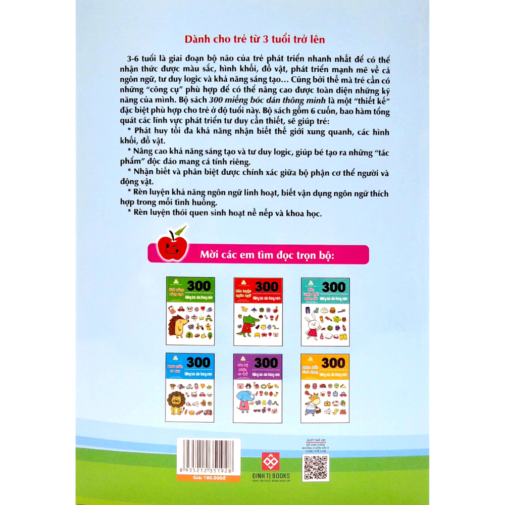 3-6 tuổi là giai đoạn bộ não của trẻ phát triển nhanh nhất để có thể nhận thức được màu sắc, hình khối, đồ vật, phát triển mạnh mẽ về cả ngôn ngữ, tư duy logic và khả năng sáng tạo. Cũng bởi thế mà trẻ cần có những "công cụ" phù hợp để có thể nâng cao được toàn diện những kỹ năng của mình. Bộ sách 300 miếng bóc dán thông minh là một "thiết kế" đặc biệt phù hợp cho trẻ ở độ tuổi này.