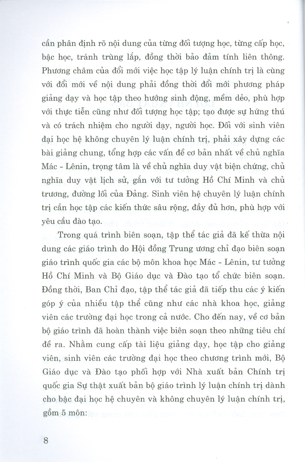 Bộ giáo trình lý luận chính trị gồm 5 cuốn dành cho bậc đại học hệ không chuyên lý luận chính trị. Bộ sách là tài liệu giảng dạy, học tập cho giảng viên, sinh