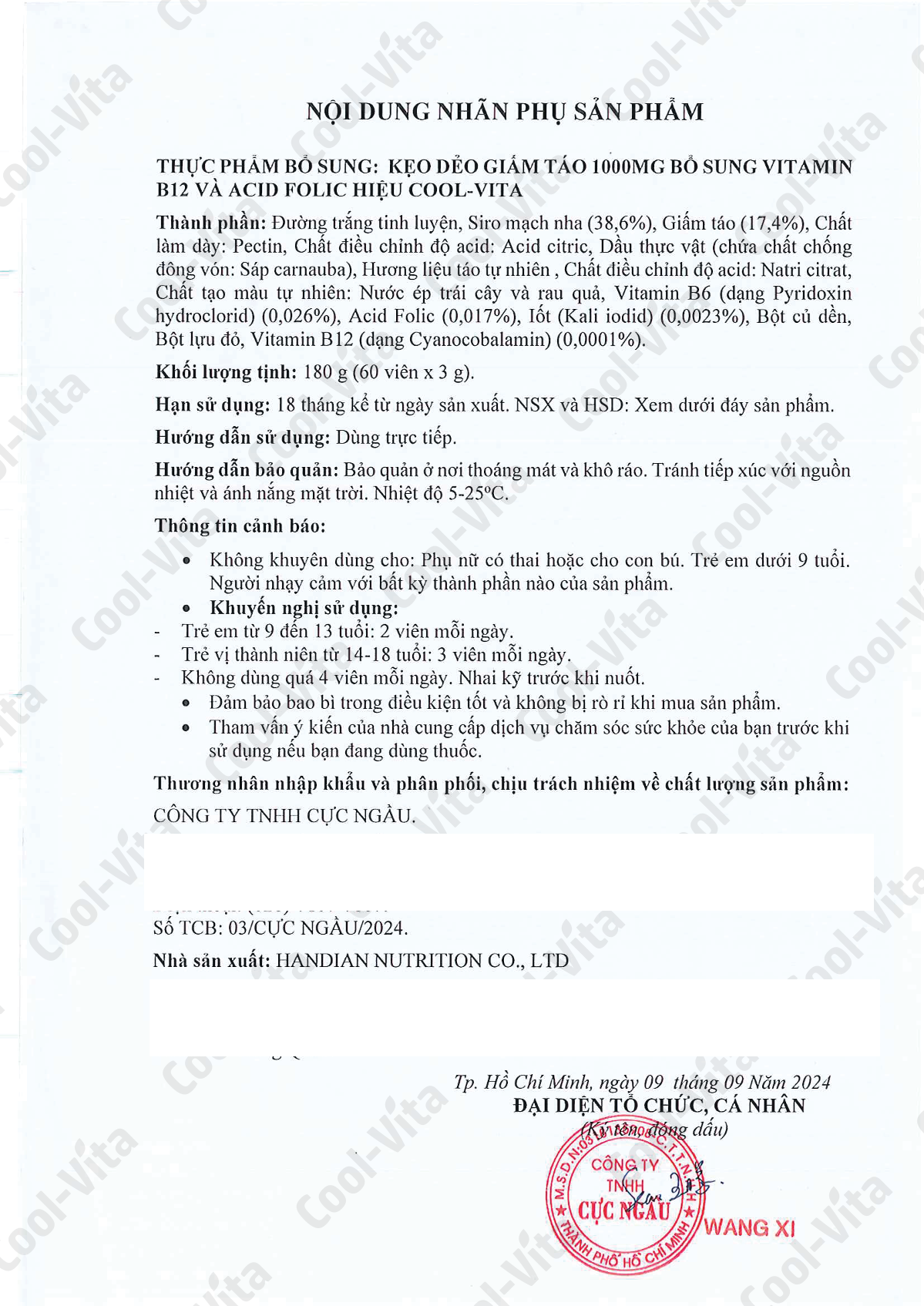 - Thân thiện với người ăn chay, an toàn và lành mạnh: Sản phẩm có chứa pectin thực vật, phù hợp cho người ăn chay, không chứa màu, hương liệu và chất bảo quản nhân tạo mà sử dụng màu sắc và hương vị tự nhiên. Vì sao nên chọn Kẹo Dẻo Giấm Táo COOL-VITA? Tiện lợi và dễ sử dụng: Chỉ với 2 viên kẹo dẻo mỗi ngày, bạn sẽ bổ sung 1000mg giấm táo và các dưỡng chất thiết yếu mà không cần phải pha chế phức tạp. Vị táo tươi mát, dễ chịu: Kẹo dẻo có vị táo tự nhiên, không gây ngán, mềm mịn, dễ ăn mà không bị dính răng. Sản phẩm an toàn, không chứa màu, hương liệu và chất bảo quản nhân tạo mà sử dụng màu sắc và hương vị tự nhiên, phù hợp với nhiều đối tượng người dùng. Khối lượng tịnh: 180g (60 viên x 3g) Thành phần: Đường trắng tinh luyện, Siro mạch nha (38,6%), Giấm táo (17,4%), Chất làm dày: Pectin, Chất điều chỉnh độ acid: Acid citric, Dầu thực vật (chứa chất chống đông vón: Sáp carnauba), Hương liệu táo tự nhiên, Chất điều chỉnh độ acid: Natri citrat, Chất tạo màu tự nhiên: Nước ép trái cây và rau quả, Vitamin B6 (dạng Pyridoxin hydrochlorid) (0,026%), Acid Folic (0,017%), Iốt (Kali iodid) (0,0023%), Bột củ dền, Bột lựu đỏ, Vitamin B12 (dạng Cyanocobalamin) (0,0001%). Hướng dẫn sử dụng: