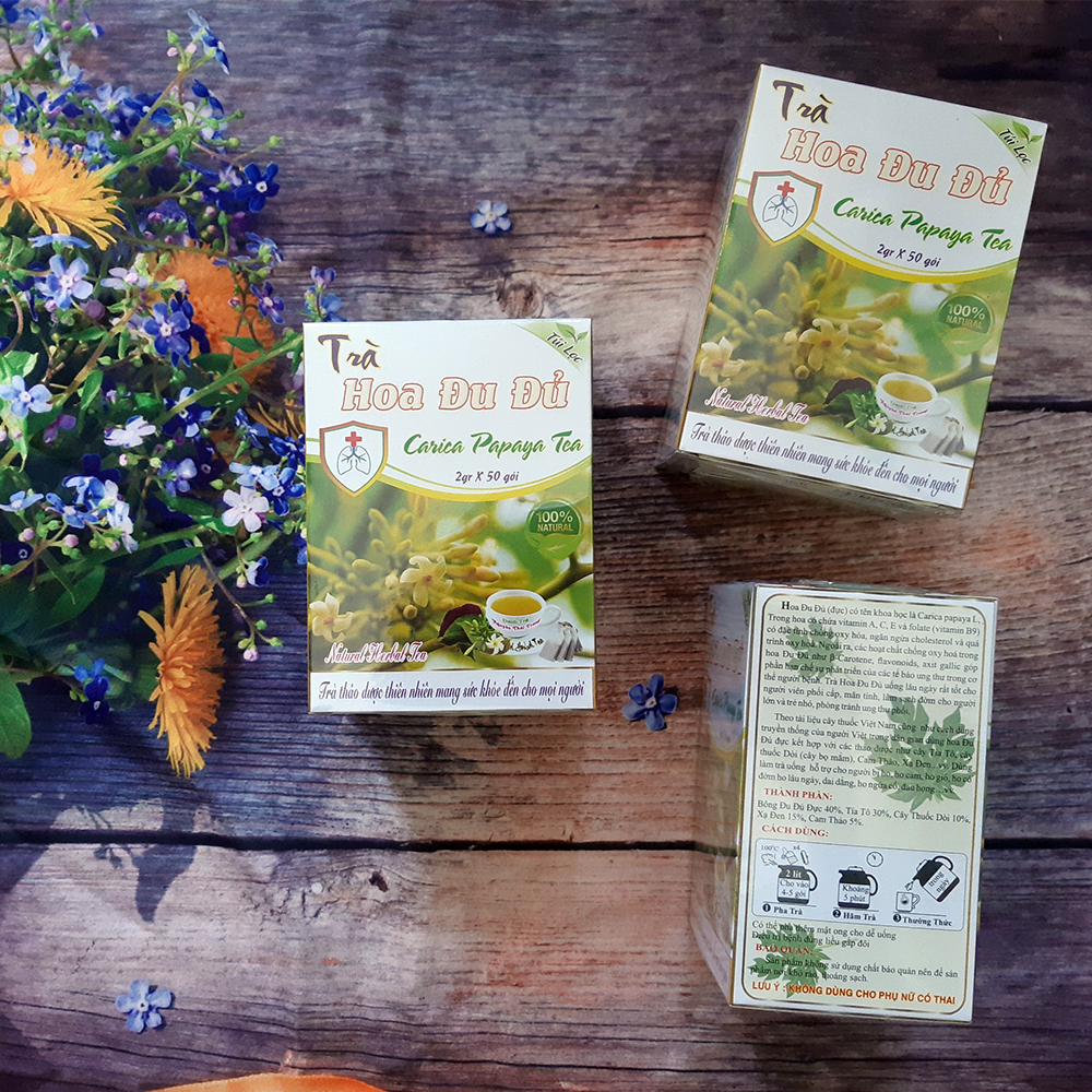 Hoa Đu Đủ (đực) có tên khoa học là Carica papaya L, Trong hoa có chứa vitamin A, C, E và folate (vitamin B9) có đặc tính chống oxy hóa, ngăn ngừa cholesterol và quá trình oxy hoá. Ngoài ra, các hoạt chất chống oxy hoá trong hoa đu đủ như β-Carotene, flavonoids, axit gallic góp phần hạn chế sự phát triển của các tế bào ung thư trong cơ thể người bệnh. Trà Hoa Đu Đủ uống lâu ngày rất tốt cho người viên phổi cấp, mãn tính, làm sạch đờm cho người lớn và trẻ nhỏ, phòng tránh ung thư phổi.