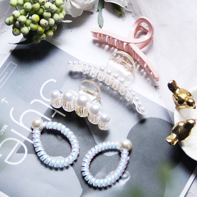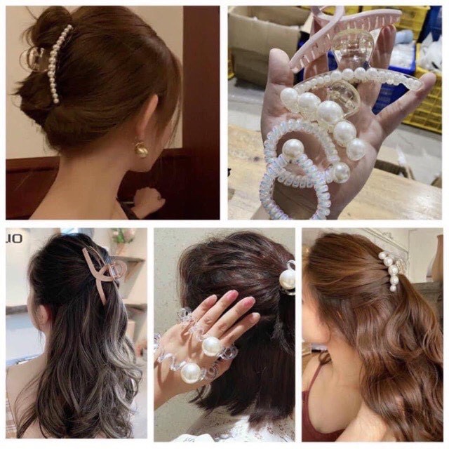 Bộ 5 món kẹp tóc đính ngọc trai, cột tóc Hàn Quốc phong cách trẻ trung xinh xắn KT28 Kẹp càng cua, dây buộc tóc đính ngọc trai là món phụ kiện tóc rất được