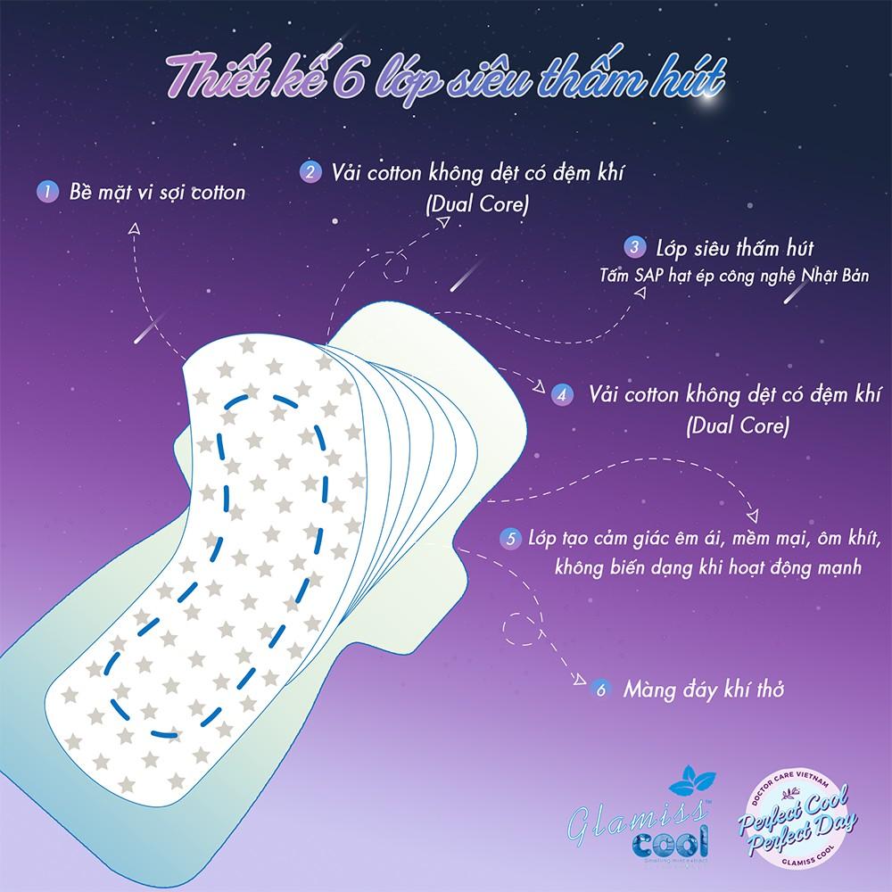 - Băng vệ sinh thảo dược Glamiss Cool ban đêm có cấu trúc 3D gồm 6 lớp thấm hút và kháng khuẩn nhưng vẫn giữ được kết cấu siêu mỏng, siêu nhẹ