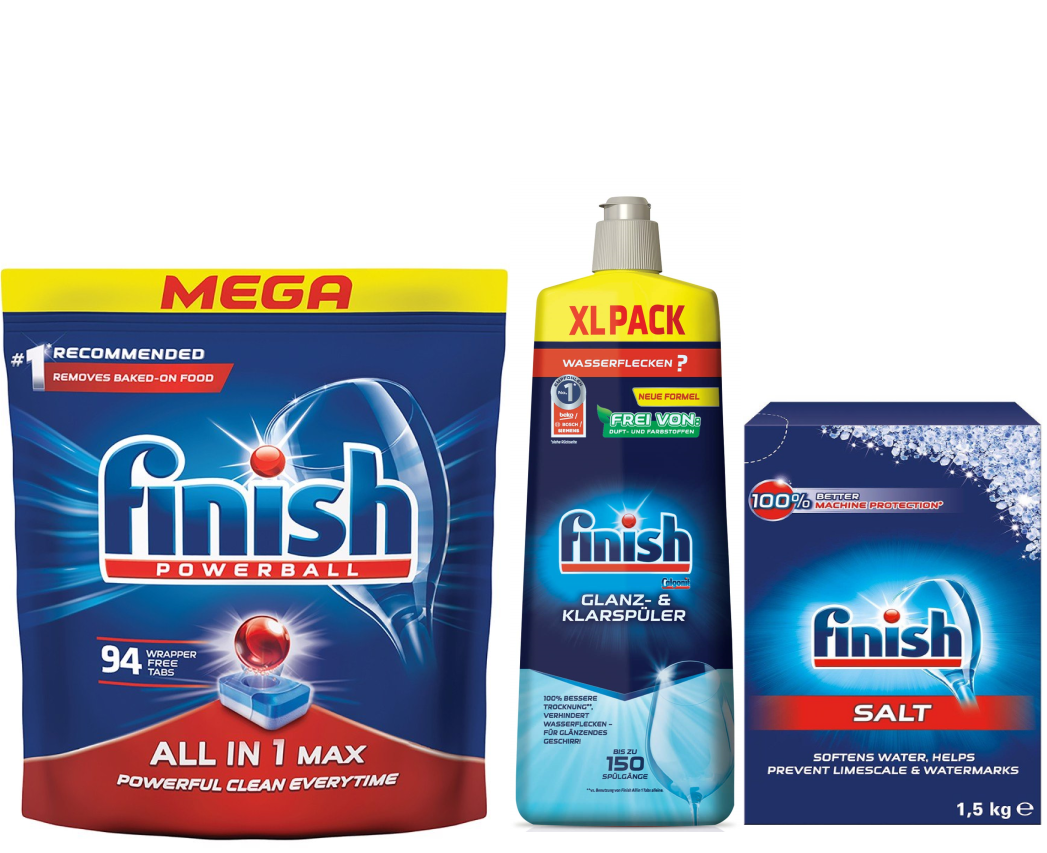 • Viên rửa bát Finish là viên rửa bát tổng hợp 3 chức năng tẩy rửa, tổng hợp cả Muối làm mềm nước và Nước làm bóng. Tuy nhiên đối với những vùng có nước nặng, nhiều kim loại, hãng Finish khuyến cáo nên sử dụng thêm sản phẩm Muối làm mềm nước để bảo vệ máy khỏi cặn vôi giúp nâng cao tuổi thọ của máy rửa bát.