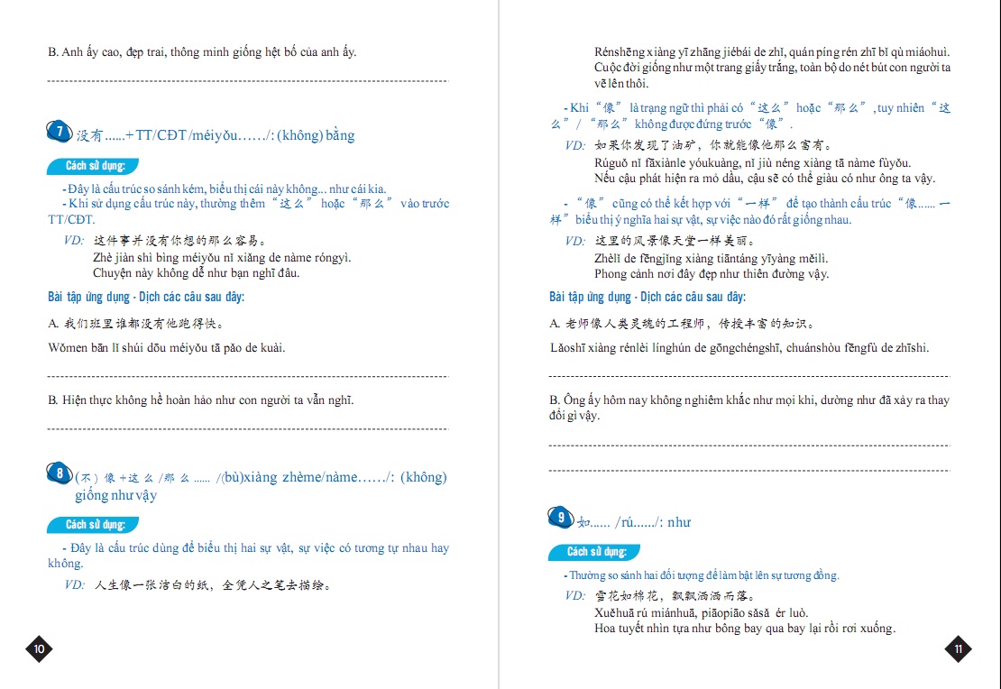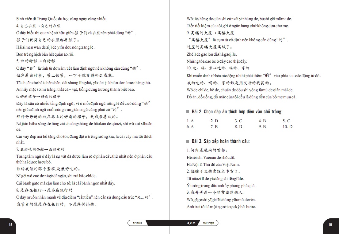 - ĐẶC_TRƯNG_NỔI_BẬT Sách với lối viết ngắn gọn, cụ thể, chia nhỏ các điểm thành từng cấu trúc tách biệt để người tự học hoàn toàn có thể hiểu và ứng dụng nhanh chóng. Sách là sự kết hợp giữa kinh nghiệm của tác giả Việt Nam và sự am hiểu sâu sắc về tiếng mẹ đẻ của tác giả Trung Quốc, đảm bảo hoàn toàn có thể tin tưởng được về độ chính xác. Sách đi đúng tinh thần hỗ trợ tối đa nên có ví dụ, tất cả chữ Hán xuất hiện đều có phiên âm giúp các bạn nhận thức cách đọc và tích lũy thêm từ vựng.