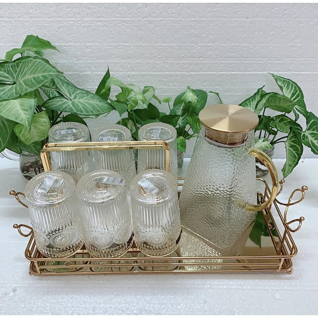 - Bộ combo Gồm 1 bình thủy tinh & 6 cốc thủy tinh HOA MẶT TRỜI 300ML + 1 khay inox tráng gương mạ vàng hình vương miện + 1 gía úp cốc kim loại mạ vàng. 2 - Bộ combo Gồm 1 bình thủy tinh & 6 cốc thủy tinh + 1 khay inox tráng gương mạ vàng hình vương miện. 3 - Bình đựng nước uống thủy tinh đáy vuông 1800ml. 4 – Khay khay inox tráng gương mạ vàng hình vương miện: 50x20,5x5cm 6 - Giá úp cốc Chất liệu kim loại. 8 – Bộ 6 cốc 360ML