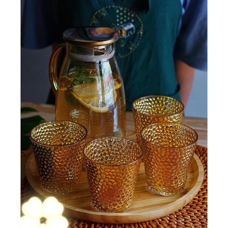 ✨Combo bộ bình đựng nước uống thủy tinh chịu nhiệt cao cấp kèm khay gỗ màu vàng