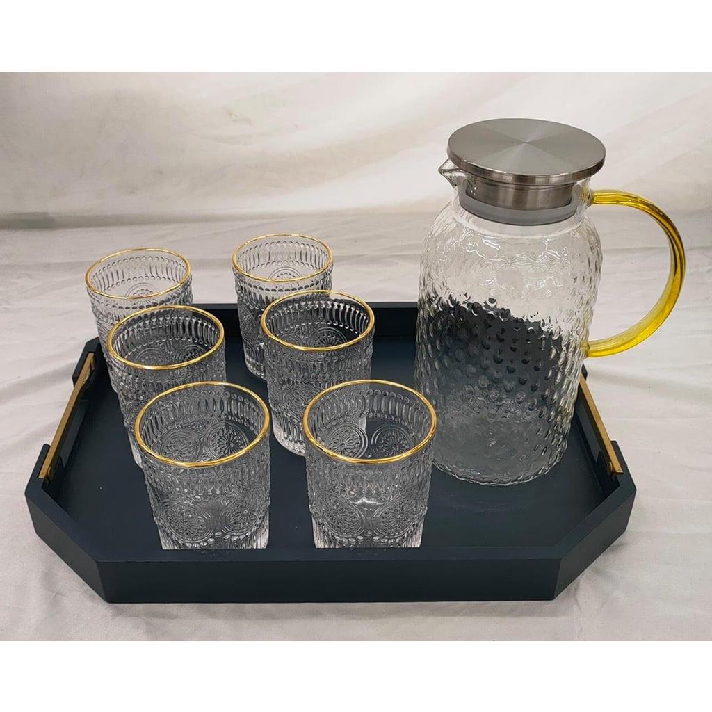 Bộ bình thuỷ tinh chịu nhiệt màu vàng gôn kèm 6 cốc phong cách Bắc Âu tạo ra một cảm giác sang trọng và vô cùng hiện đại