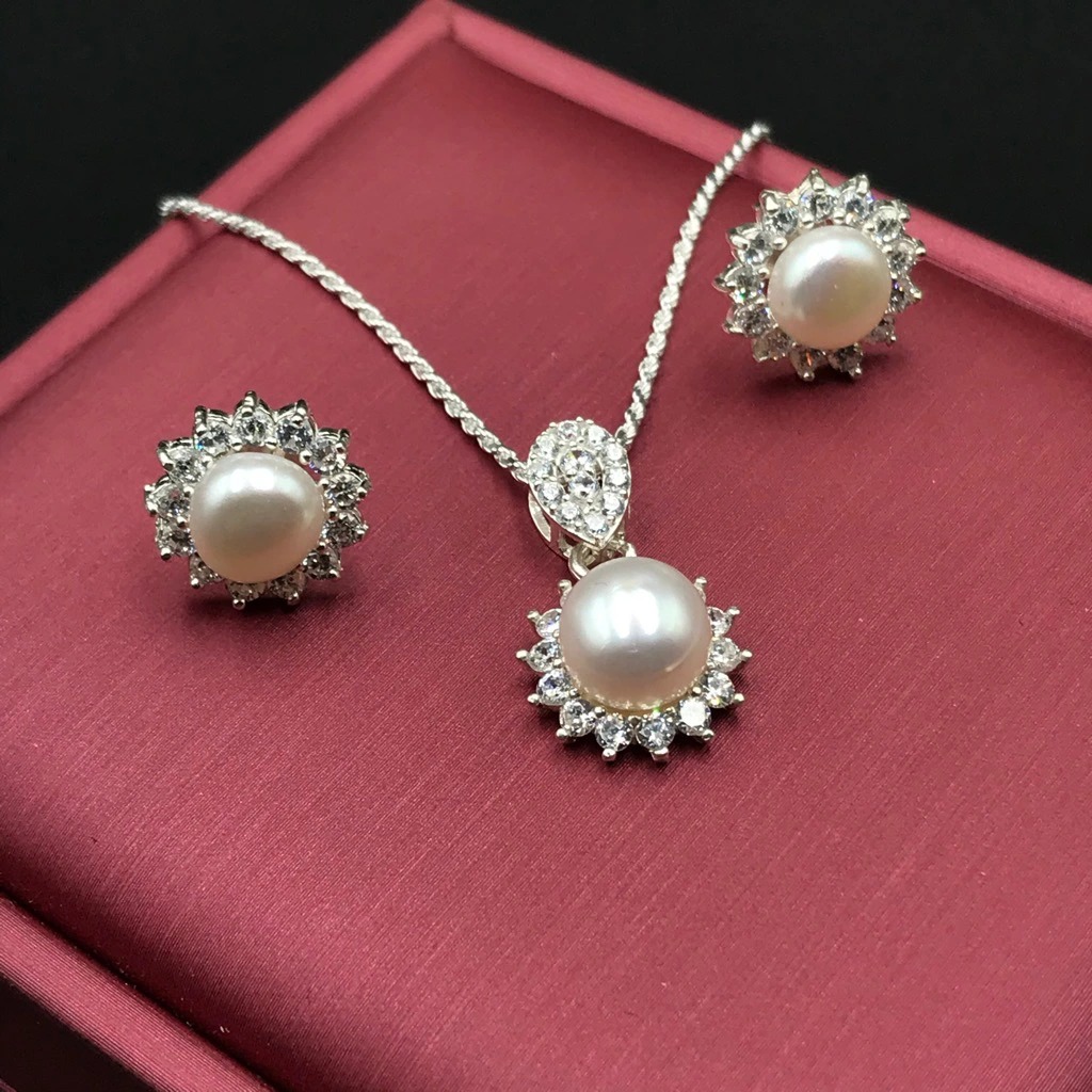 Chất liệu: Ngọc trai nuôi Kích thước: Hạt 8 - 9 mm Bao gồm: Dây chuyền đeo cổ, vòng đeo tay và bông tai Sang trọng để làm quà tặng người phụ nữ yêu quý