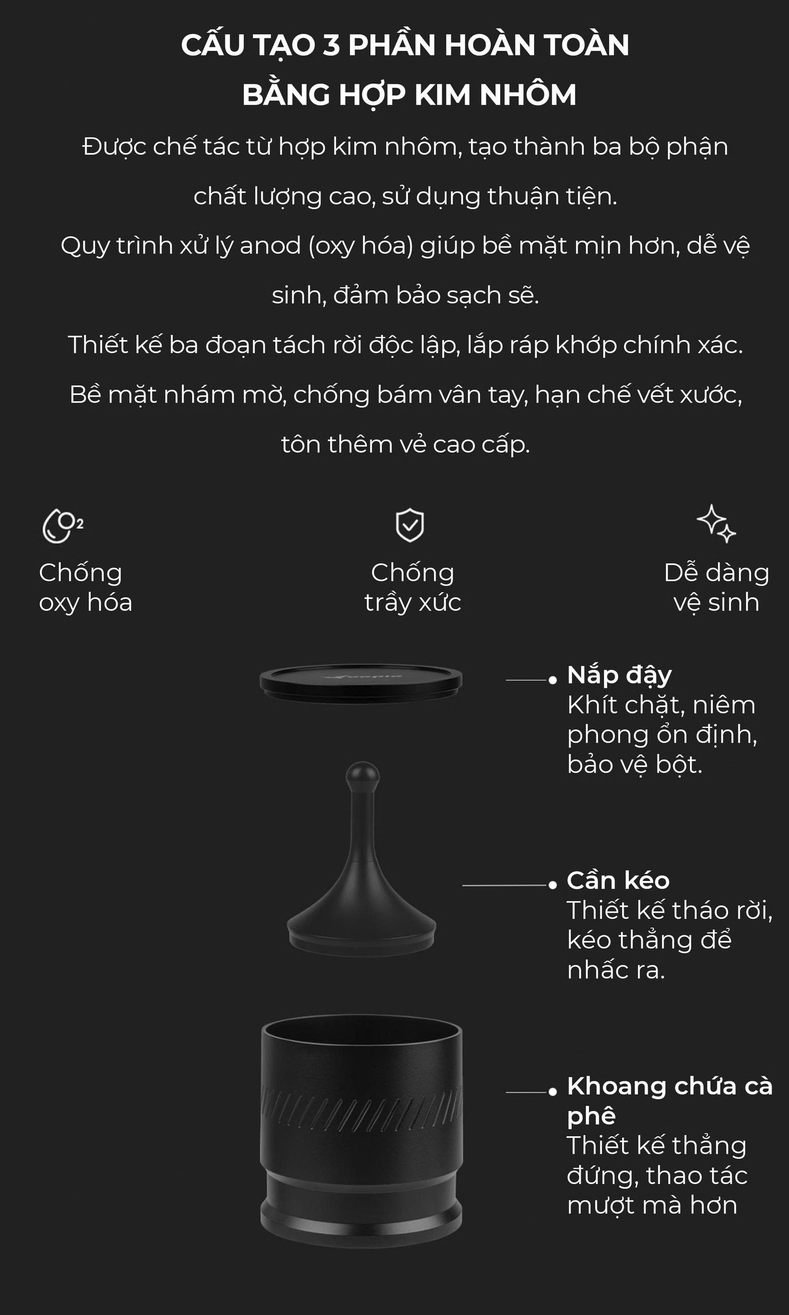 ƯU ĐIỂM NỔI BẬT: Phù hợp mọi máy pha 58mm Thiết kế chống bám bột – vệ sinh siêu nhanh Chất liệu cao cấp – chắc chắn – bền đẹp Chuẩn SCA – đạt tiêu chuẩn quán cà phê chuyên nghiệp