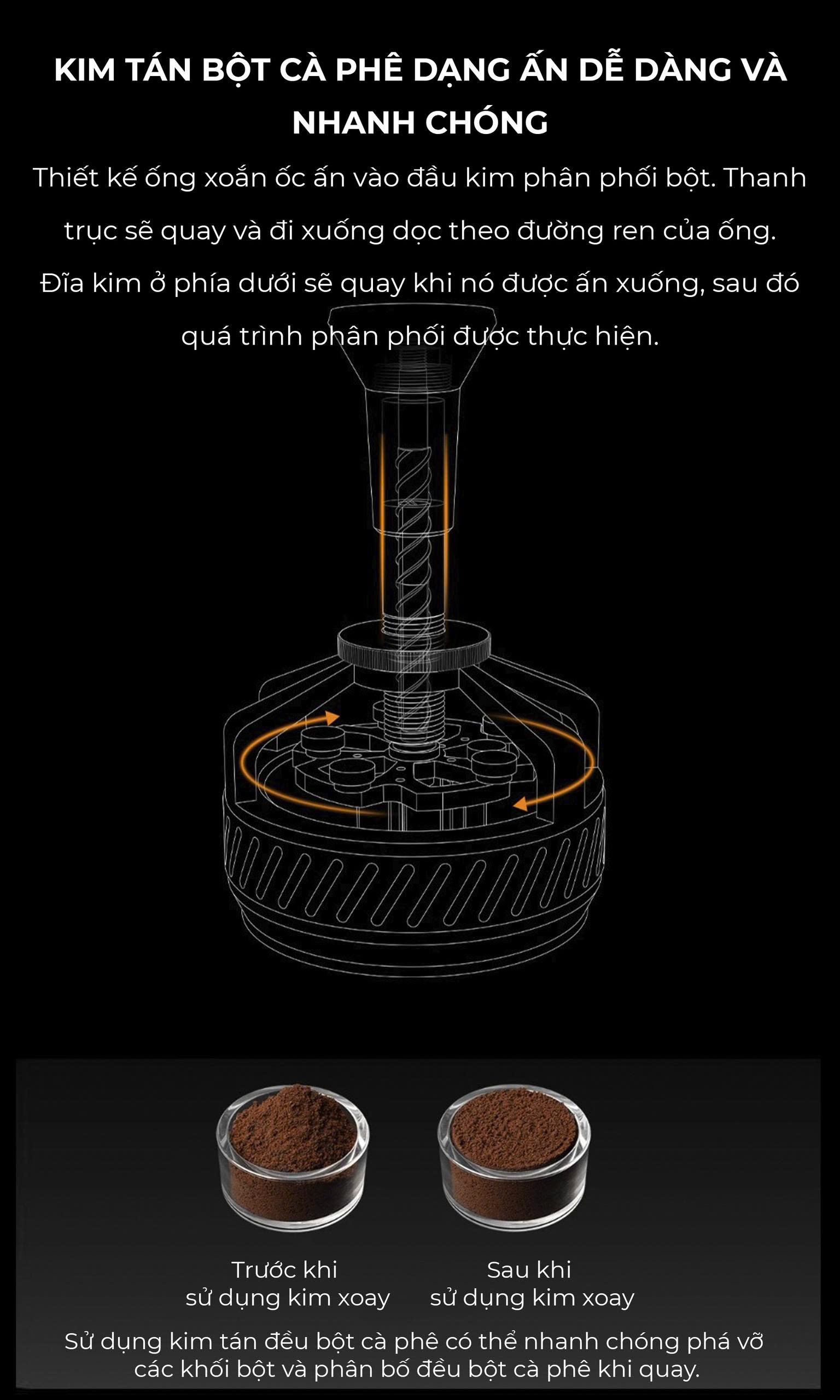 - Kim xoay tán đều bột THOR • Xoắn ốc đều tay – đĩa kim quay tròn khi ấn • Phân bổ bột đồng đều, không vón cục