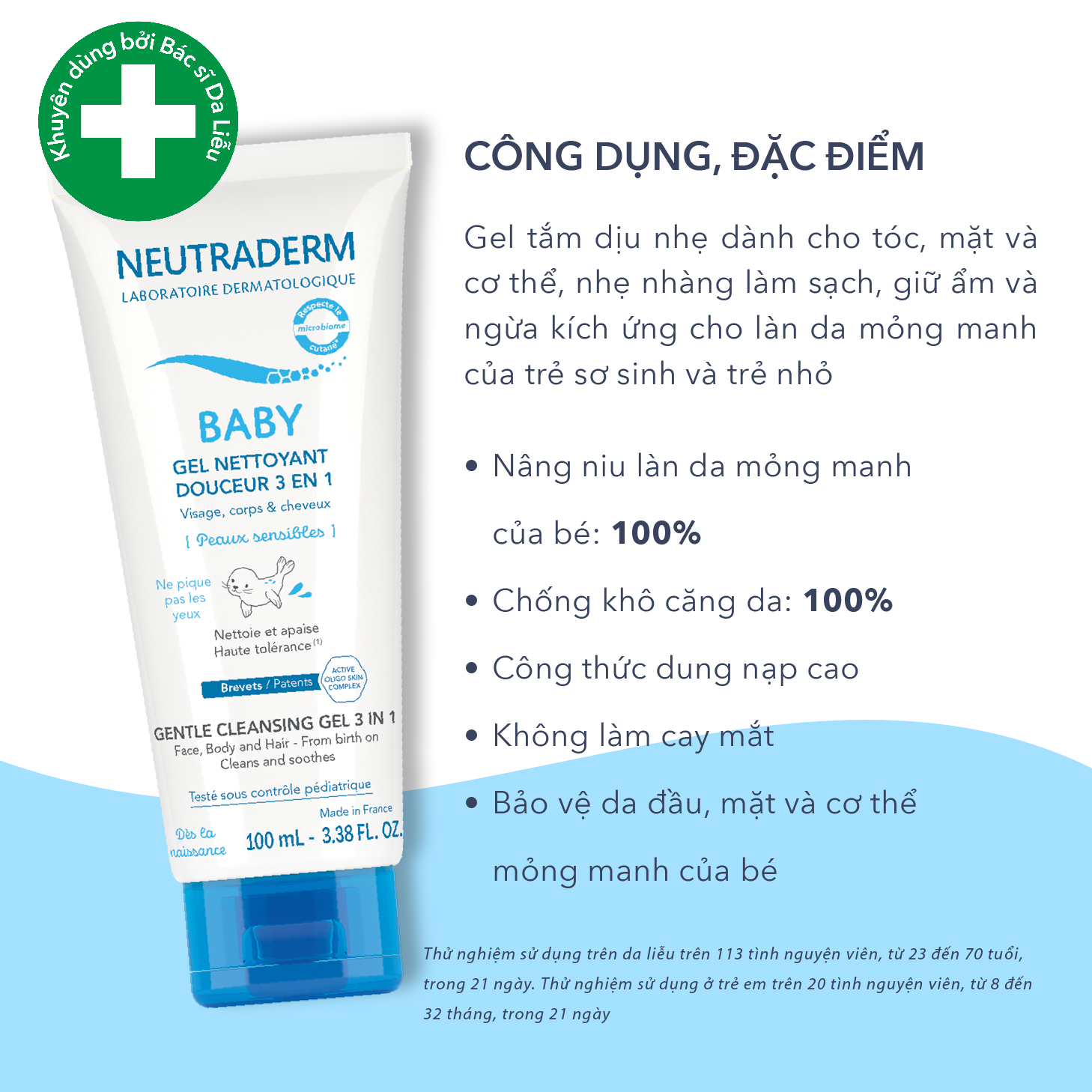 Mua tại TiktokCombo Gel tắm 3in1 Neutraderm + Nước biển sâu Marimer Baby Blocked Combo Gel tắm 3in1 Neutraderm + Nước biển sâu Marimer Baby Blocked Gel Tắm Gội Cho Bé 3 Trong 1 NEUTRADERM Làm Sạch Dịu Nhẹ An Toàn Cho Da Bé chứa phức hợp hoạt tính Active Oligo Skin Complex chiết xuất từ nước biển IROISE không chỉ làm sạch dịu nhẹ mà còn cung cấp độ ẩm cần thiết bảo vệ làn da mỏng manh của bé. THÔNG TIN SẢN PHẨM Sữa Tắm Cho Bé 3 Trong 1 NEUTRADERM Công dụng: