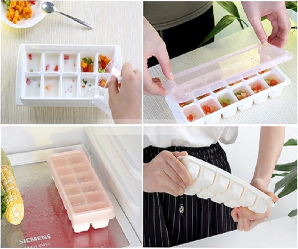 • Vệ sinh sạch sẽ trước & sau khi dùng 1/ Cho thực phầm cần trữ đông & bảo quản vào khay 2/ Đậy nắp vào sao cho khít với thân khay 3/ Đặt khay vào trong ngăn đông của tủ lạnh/ tủ đông 4/ Sau khi trữ đông, mở tủ lạnh lấy khay ra, mở nắp và lấy từng phần theo nhu cầu sử dụng