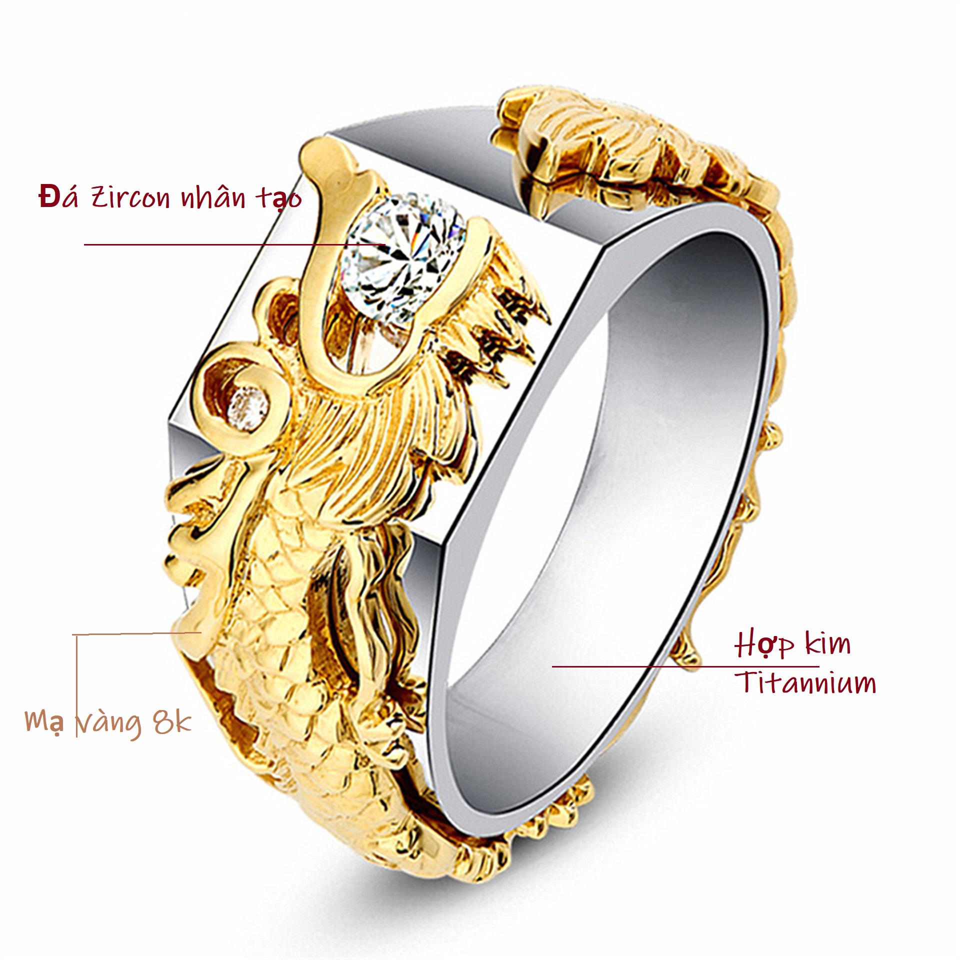 Chất liệu Thân Nhẫn: Hợp kim Titanium Chất liệu đá: Đá Zircon nhân tạo, kiểu dáng kim cương Thiết kế: Khắc rồng trên thân và mặt nhẫn, tinh xảo, chi tiết. Công dụng: Trang sức,