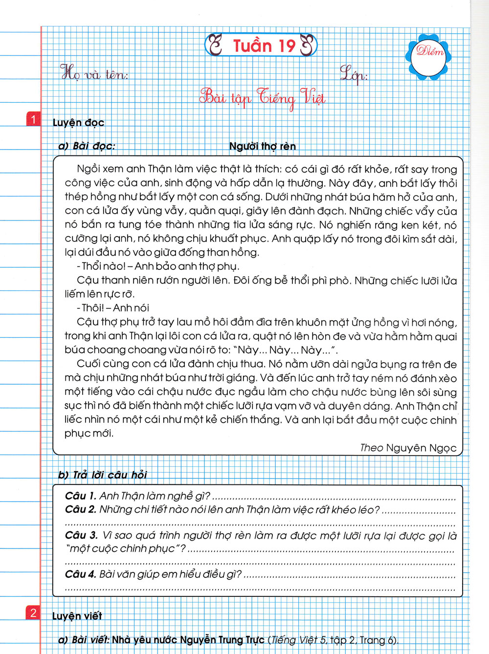 Phần tiếng Việt, các bạn nhỏ sẽ luyện tập phần đọc hiểu văn bản, tóm tắt và trả lời câu hỏi. Ngoài ra, còn có phần luyện tập cách lập dàn ý cho bài Tập làm văn hay như điền khuyết để rèn luyện chính tả