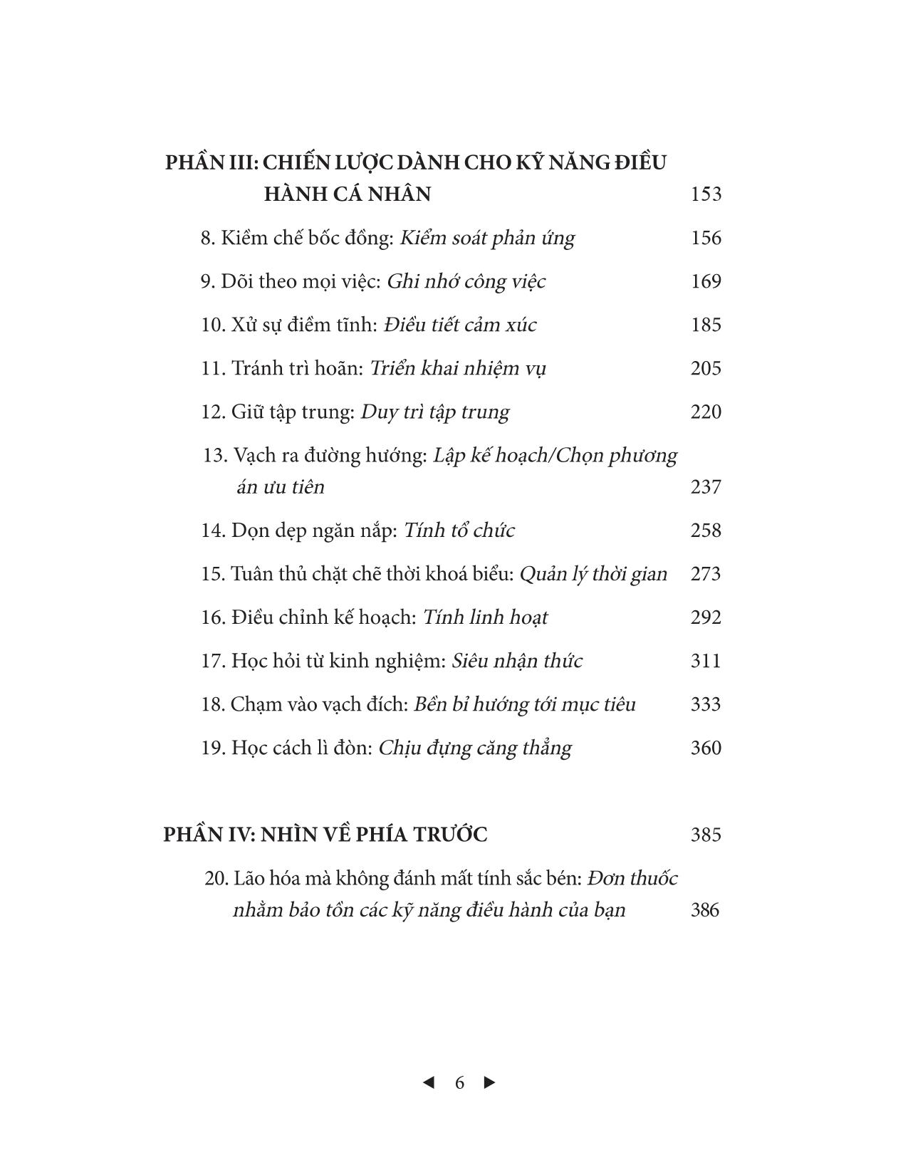 Bạn là một người thông minh, nhưng lại thường xuyên “đụng đâu hỏng đó”, dễ mất bình tĩnh, khó lòng kiểm soát các công việc hằng ngày và thường xuyên bị căng thẳng? Bạn không cô đơn đâu. Trước hàng loạt vấn đề phải giải quyết ở nơi làm việc cũng như ở nhà, rất nhiều người phải xoay như chong chóng mà vẫn không thể sắp xếp được tình hình sao cho ổn thỏa. Chìa khóa để giải quyết vấn đề này nằm ở việc mài giũa các kỹ năng điều hành thiết yếu của mỗi cá nhân. 12 kỹ năng điều hành có trong sách là những năng lực thiết yếu để chúng ta duy trì sự tập trung, cân bằng cảm xúc và xử lý vấn đề một cách logic. Bạn sẽ học được cách quản lý thời gian, lập kế hoạch, duy trì sự bền bỉ hướng tới mục tiê và nhiều kỹ năng quan trọng khác. Với việc vạch ra các chiến lược cụ thể dựa trên thông tin khoa học và cung cấp các ví dụ hết sức gần gũi, hai tác giả Peg Dawson và Richard Guare giúp bạn nhanh chóng áp dụng được các bí quyết vào đời thực, để bạn có thể nâng cao hiệu quả làm việc của m.ình và tận hưởng một cuộc sống không còn tồn tại những căng thẳng không cần thiết.