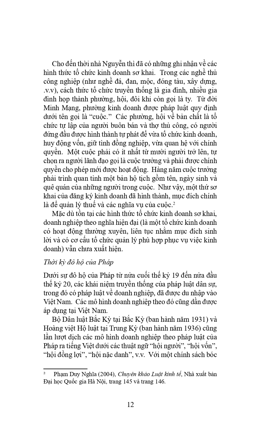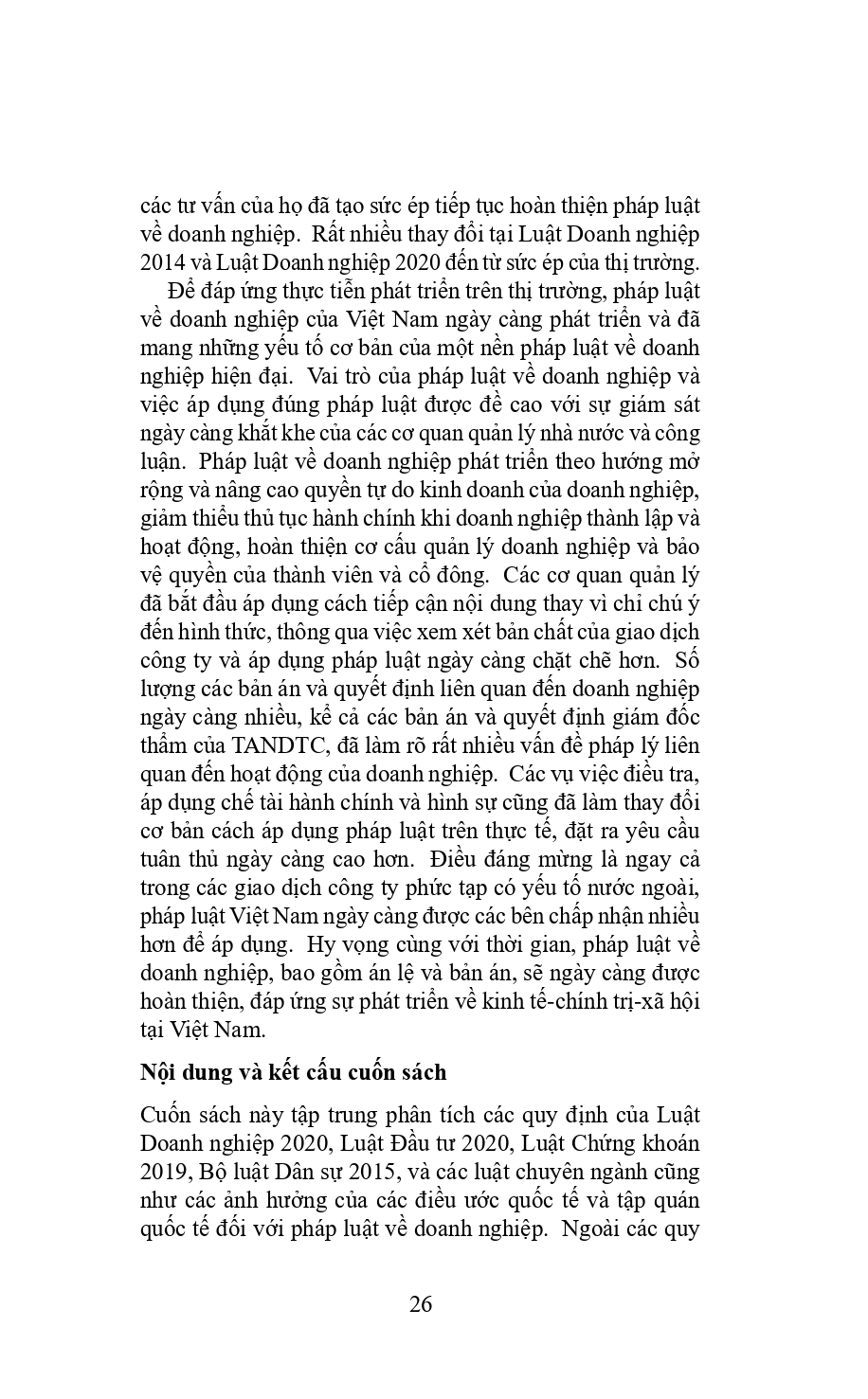 - Pháp luật về doanh nghiệp – Các vấn đề pháp lý cơ bản (tái bản lần 1 năm 2024) Tác giả: Trương Nhật Quang Nhà xuất bản: Dân Trí Công ty phát hành: Công ty TNHH Sách Á Châu Kích thước: 15.5x 24.5 cm Số trang: 1100 trang Ngày phát hành: 3.2024 Hình thức bìa: Bìa mềm Giá bìa: 900.000 đ Lời giới thiệu: Cuốn sách đầu tiên nghiên cứu một cách có hệ thống các vấn đề pháp luật về doanh nghiệp của Việt Nam từ cả góc độ lý thuyết và thực tiễn, tập trung vào các giao dịch mua bán doanh nghiệp và tài chính-ngân hàng có yếu tố nước ngoài dựa trên kinh nghiệm hành nghề thực tế của luật sư Trương Nhật Quang. Công ty luật YKVN nơi tác giả làm việc là một trong các công ty luật hàng đầu Việt Nam và tham gia tư vấn trong nhiều giao dịch giao dịch mua bán doanh nghiệp và tài chính-ngân hàng có yếu tố nước ngoài quan trọng nhất trên thị trường. Đây là ấn bản sửa đổi lần đầu của cuốn sách được luật sư Trương Nhật Quang xuất bản năm 2016. Được viết trong trong 4 năm qua, cuốn sách cập nhập các thay đổi luật từ năm 2016, đặc biệt là Luật Doanh nghiệp năm 2020, Luật Đầu tư năm 2020, Luật Chứng khoán năm2019, Bộ luật Hình sự năm 2015 (được sửa đổi, bổ sung năm 2017) và nhiều văn bản pháp luật quan trọng khác. Do vậy, nội dung cuốn sách gần như được cập nhật lại mới hoàn toàn để phân tích khung pháp lý mới đang áp dụng tại thời điểm hiện nay. Ngoài việc phân tích các văn bản pháp luật, cuốn sách cũng phân tích các án lệ và nhiều bản án, quyết định và phán quyết của tòa án và trọng tài mà tác giả đã sưu tầm trong thời gian qua. Đặc biệt cuốn sách phân tích rất nhiều bản án phúc thẩm và giám đốc thẩm của các tòa án tại Hà Nội, Đà Nẵng và Thành phố Hồ Chí Minh và Tòa án Nhân dân Tối cao. Do vậy, nhiều vấn đề pháp lý cơ bản trình bày trong cuốn sách được phân tích từ góc độ thực tiễn xét xử tại tòa án. Cuốn sách bao gồm nhiều sơ đồ và bảng tóm tắt để giúp người đọc dễ hiểu hơn các vấn đề pháp lý và cơ cấu giao dịch được trình bày trong cuốn sách. Ngoài ra, để giúp người đọc tiện tra cứu, cuốn sách có (i) bảng tra cứu từ khóa, (ii) bảng tra cứu án lệ, bản án và quyết định và (iii) danh sách các tài liệu trích dẫn. Trải dài trong hơn 1000 trang, cuốn sách phân tích các vấn đề pháp lý cơ bản liên quan đến việc thành lập, tổ chức quản lý và hoạt động của doanh nghiệp. Kết cấu của cuốn sách gồm hai mươi chương và chia làm năm phần, tập trung vào hai hình thức doanh nghiệp thông dụng nhất là công ty trách nhiệm hữu hạn (CTTNHH) và công ty cổ phần (CTCP). • Phần I (từ Chương 1 đến Chương 9) phân tích các vấn đề pháp lý chung và áp dụng cho mọi loại hình doanh nghiệp. • Phần II (từ Chương 10 đến Chương 12) tập trung vào các vấn đề pháp lý liên quan đến tư cách và quyền của thành viên CTNHH và cổ đông CTCP. • Phần III (từ Chương 13 đến Chương 15) trình bày các vấn đề pháp lý về quản trị CTTNHH và CTCP. • Phần IV (Chương 16 và Chương 17) trình bày các vấn đề pháp lý liên quan đến huy động vốn dưới hình thức phát hành chứng khoán và biện pháp bảo đảm. • Phần V (từ Chương 18 đến Chương 20) trình bày các vấn đề pháp lý áp dụng riêng cho công ty đại chúng. Cuốn sách được viết chủ yếu dành cho luật sư, người tham gia công tác giảng dạy, sinh viên luật và người quản lý doanh nghiệp mong muốn tìm hiểu các vấn đề pháp lý về doanh nghiệp. Đặc biệt, cuốn sách giúp các luật sư hành nghề có thể tham khảo khi tư vấn trong các giao dịch doanh nghiệp, đặc biệt là các giao dịch mua bán doanh nghiệp và tài chính-ngân hàng có yếu tố nước ngoài.