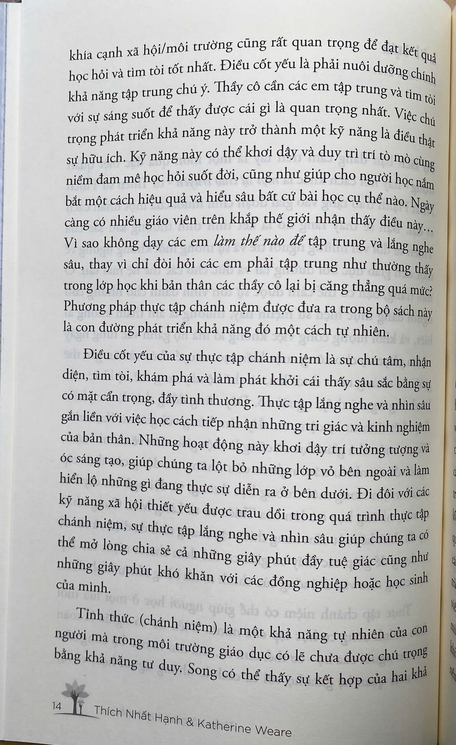 “Thầy cô giáo hạnh phúc sẽ thay đổi thế giới” - bộ sách bạn đang cầm trên tay là một món quà đặc biệt quan trọng - hay nói cách khác là một sự trao truyền - từ Thiền sư Thích Nhất Hạnh trao tặng vào giai đoạn chín muồi của một nhân cách vĩ đại. Bạn sẽ thấy rằng nó là kết tinh tình thương sâu sắc của Thiền sư đối với những người trẻ và sự mong mỏi không ngừng về một nền giáo dục bồi dưỡng tài và đức cho các thế hệ mai sau. Ở mỗi trang, bạn có thể cảm được sự tôn vinh dành cho những con người đang thực hiện sứ mệnh này, thường là âm thầm không ai biết, và khối lượng công việc khổng lồ mà họ gánh vác từng ngày nhằm phục vụ cho công cuộc kiến tạo, chuyển hóa và hàn gắn thế giới của chúng ta từ dưới lên, từ thế hệ này sang thế hệ khác - đó là những người thầy, người cô. Đây cũng đồng thời là tác phẩm được kết tinh từ sự cộng tác đầy cảm hứng với giáo sư Katherine Weare, một nhà giáo dục và cũng là một giáo viên về chánh niệm, người đã có nhiều năm nghiên cứu những tác động của thực tập chánh niệm trong môi trường học đường, và đội ngũ các cây bút cố vấn, những học trò lớn của Thiền sư từ Làng Mai. Cùng nhau họ đã thiết kế một cẩm nang thiền tập mang tính đa diện và rất dễ sử dụng để giúp các thầy cô giáo có thể đem chánh niệm vào lớp học cũng như vào đời sống của chính mình bằng nhiều hình thức. Bộ sách gồm 2 cuốn: Tập 1 “Cẩm nang hạnh phúc”, tập 2 “Đi như một dòng sông” Trong cuốn “Cẩm nang hạnh phúc” thầy Thích Nhất Hạnh và tác giả Katherine Weare sẽ chia sẻ chi tiết về chánh niệm và tỉnh thức. Bởi thế giới đang thay đổi quá nhanh đến nỗi chúng ta không thực sự biết được nền tảng tri thức và kỹ năng nào sẽ là quan trọng nhất mà các thế hệ kế cận cần phải trau dồi. Nhưng điều mà chúng ta có thể biết chắc là muốn sáng tạo, yêu nghề, thích nghi với thời đại kỹ thuật số và học hỏi suốt đời thì người trẻ ở lứa tuổi nào cũng cần phải phát triển kỹ năng sống với giây phút hiện tại. Điều này bao gồm kỹ năng làm bạn với chính mình, tin tưởng những trải nghiệm trong nội tâm và học cách làm chủ môi trường bên trong, gồm thân và tâm của mình, cũng như biết cách thích nghi với môi trường học tập bên ngoài khi tương tác với những người khác. Đánh thức khả năng sáng tạo và trí tưởng tượng của bản thân trong suốt cuộc đời theo cách thức này là một yếu tố quan trọng dẫn tới thành công và hạnh phúc như tiêu đề của  bộ sách. Một trong những nguyên tắc chính ở đây là các thầy cô giáo cần thực tập chánh niệm trong đời sống của chính mình trước khi có thể đưa nó vào lớp học một cách hiệu quả. Nếu bạn làm nghề giáo và mới biết đến phương pháp chánh niệm, bộ sách này sẽ hướng dẫn hết sức chi tiết cách bạn thực tập cho chính mình, cũng như cách bạn có thể đưa nó vào lớp học theo cách riêng của mình để giúp học sinh phát triển lành mạnh về thể chất và tinh thần, biết cách chăm sóc cảm xúc và có niềm vui trong khi học. Cần lưu ý rằng không có một phương pháp nào là phù hợp cho mọi hoàn cảnh. Cái hay của cách nhìn này là cho bạn một loạt các lựa chọn để thử nghiệm và trên hết là nhắc bạn nhớ rằng chính sự sáng tạo của riêng bạn, được nuôi dưỡng bởi sự thực tập chánh niệm, sẽ mang đến muôn vàn những cơ hội mới và đầy thú vị. Nói một cách thực tế thì học trò của bạn sẽ là người giúp khơi mở nguồn tuệ giác đó trong bạn. Các em chính là những người thầy chánh niệm vĩ đại nhất của bạn. Điểm hay của phương thức tiếp cận này là nó có thể bắt nguồn từ tình yêu nghề và tấm lòng mong mỏi học trò tiến bộ, được ấp ủ và truyền đạt bởi chính trực giác và kinh nghiệm thực tiễn của bạn; tất cả những điều này đều dựa vào công phu thực tập trong từng thời khắc của bạn. Theo như tôi nghiệm thấy, những băn khoăn, học hỏi, quán chiếu cứ lớn lên không ngừng trên mảnh đất nuôi dưỡng ấy.