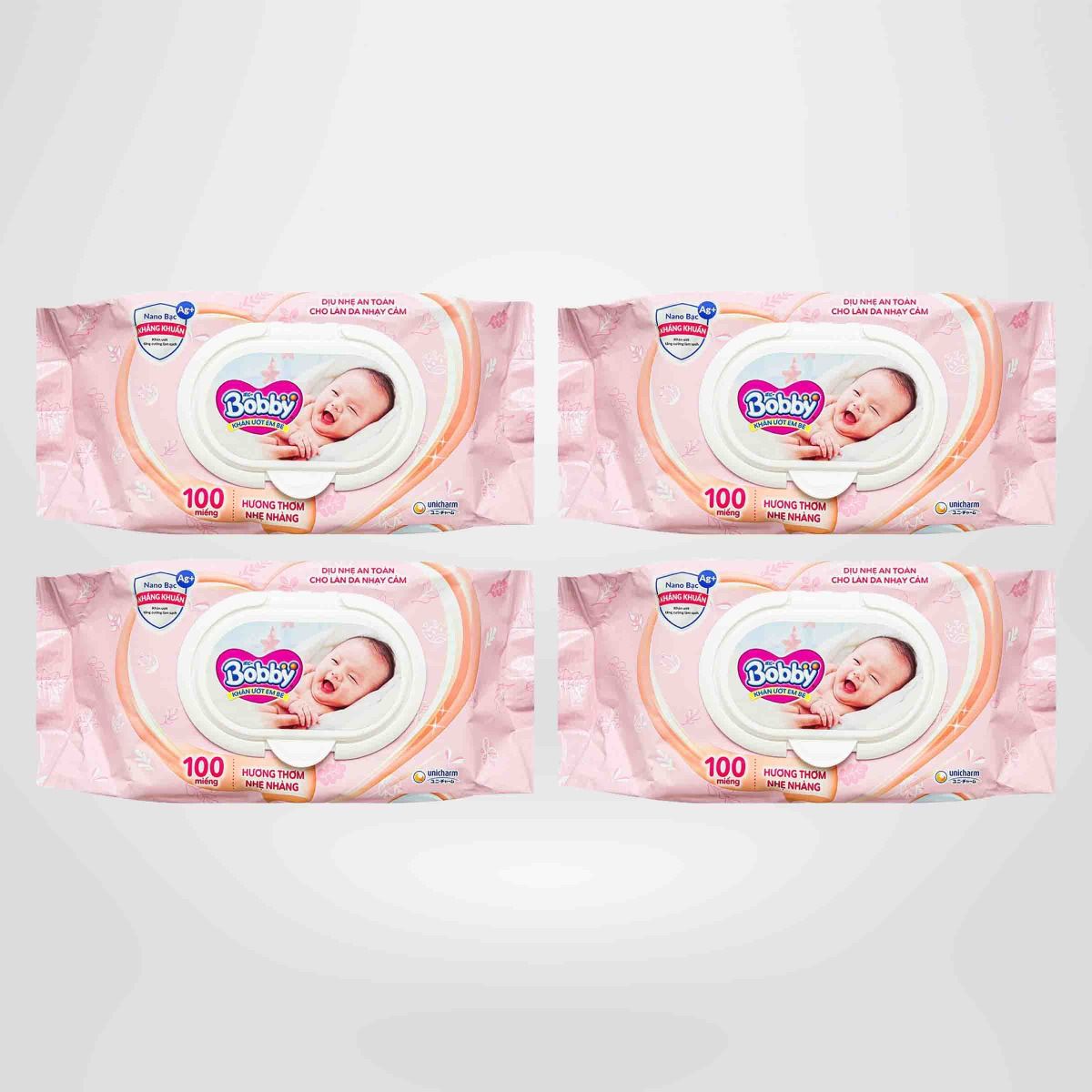 ✨Combo Tiết Kiệm 3 Gói Khăn Ướt Bobby Care Hương Dịu Nhẹ 100 Tờ/Gói - Tặng 1 Gói Cùng Loại