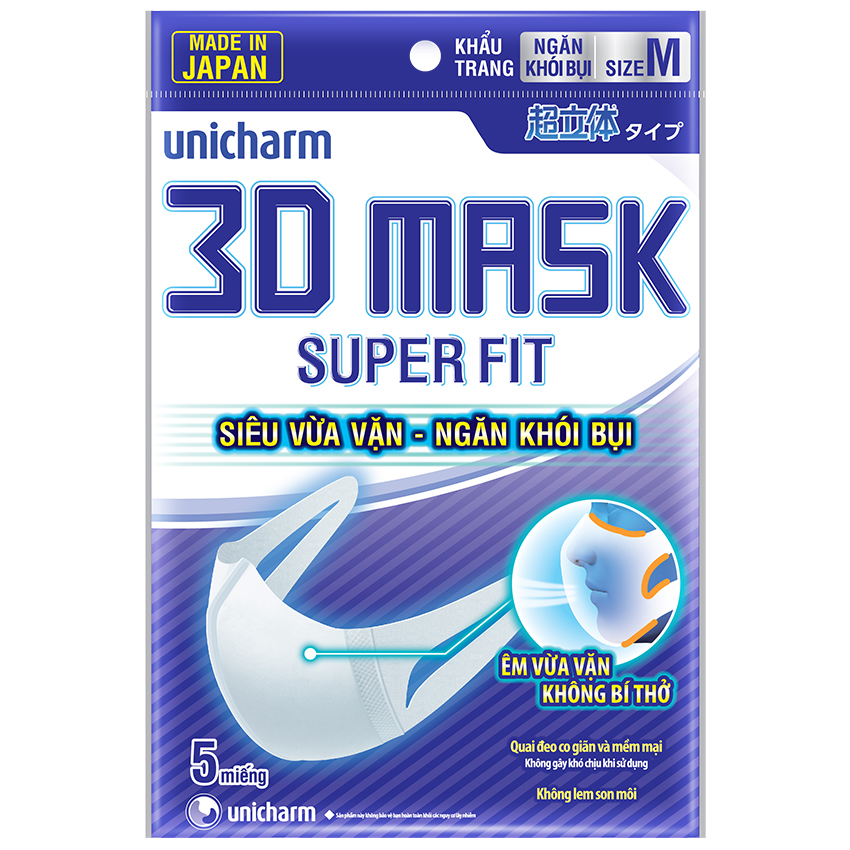 - Khẩu Trang Ngăn Khói Bụi Unicharm 3D Mask Super Fit Size M Gói 5 Miếng được thiết kế 3D thông minh cho phép sản phẩm ôm vừa vặn đường cong khuôn mặt, cho cảm giác thoải mái, dễ chịu, không gây bí thở mà vẫn đảm bảo giữ nhiệt và độ ẩm cho mũi và họng vào mùa đông.