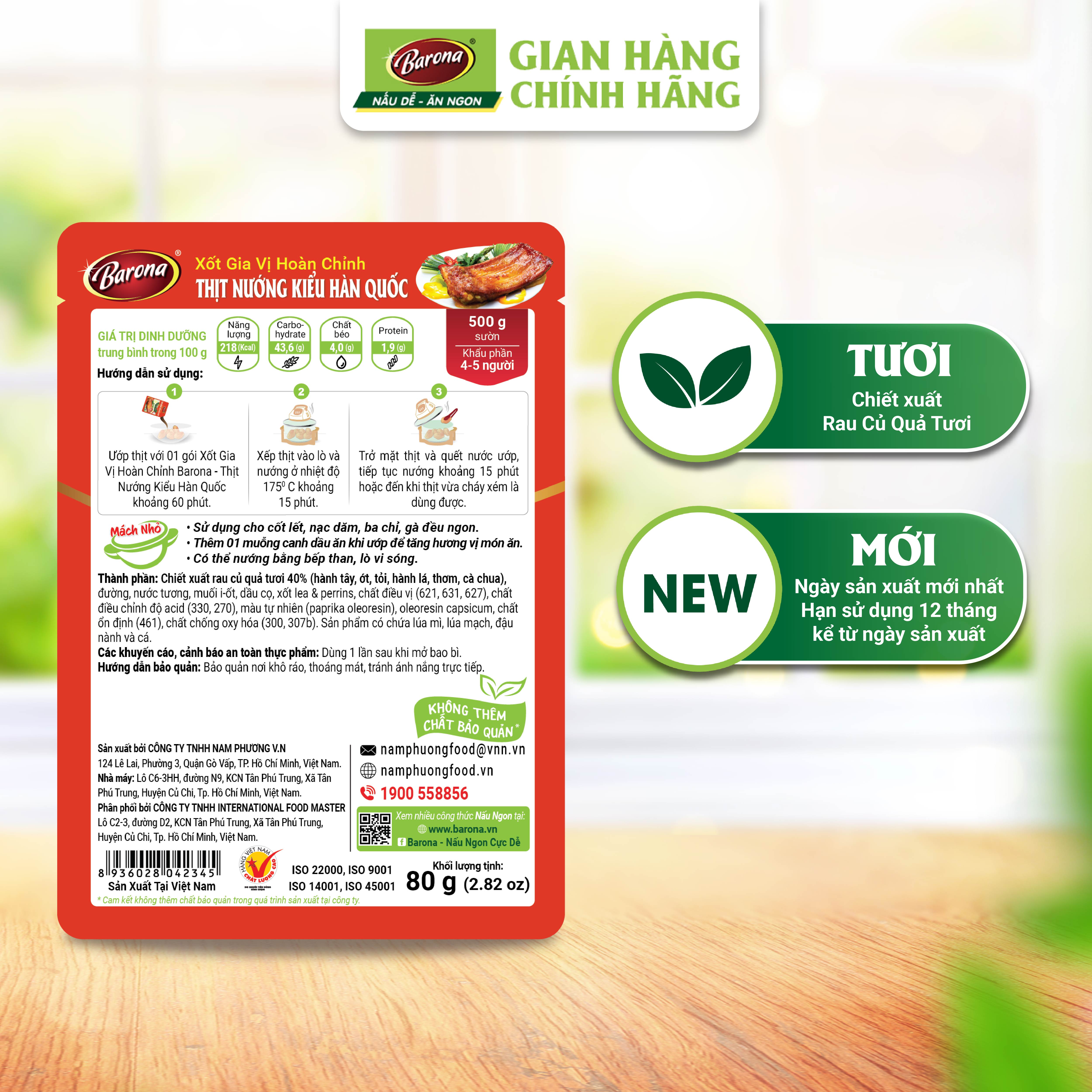 - Đạt Hàng Việt Nam Chất Lượng Cao Xốt Gia Vị Hoàn Chỉnh Barona Thịt Nướng Kiểu Hàn Quốc còn có thể dùng làm xốt chấm cho các món nướng, chiên. QUY CÁCH: 80g/gói x 20 gói/hộp x 4 hộp/thùng HSD: 15 tháng *HƯỚNG DẪN THỰC HIỆN: Khẩu phần 4-5 người Chuẩn bị: