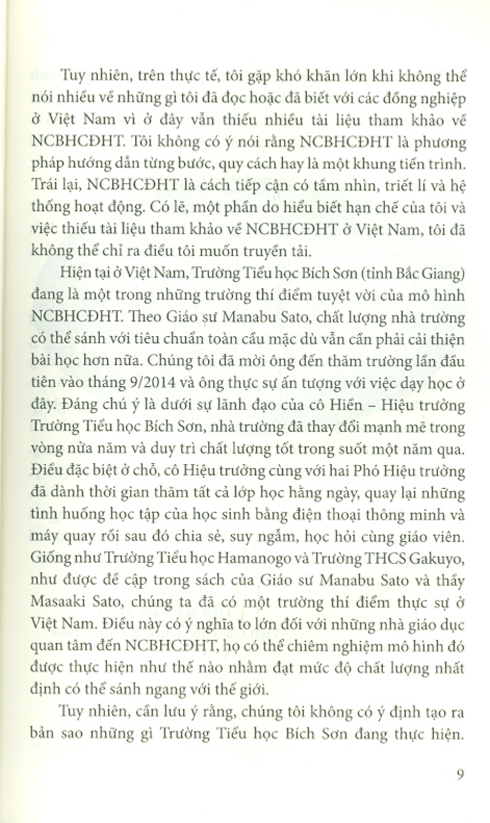 Cuốn sách này là sự kết hợp từ một cuốn sách của Giáo sư Manabu Sato và hai chương sách của thầy Masaaki Sato. Cuốn sách đầu tiên “Đổi mới nhà trường: Thiết kế và