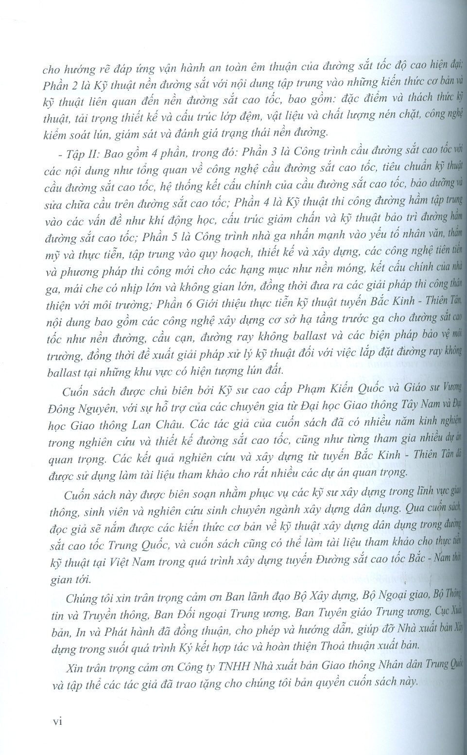 Cuốn sách này được biên soạn nhằm phục vụ các kỹ sư xây dựng trong lĩnh vực giao thông, sinh viên và nghiên cứu sinh chuyên ngành xây dựng dân dụng. Qua cuốn sách, đọc giả sẽ nắm được các kiến thức cơ bản về kỹ thuật xây dựng dân dụng trong đường sắt cao tốc Trung Quốc, và cuốn sách cũng có thể làm tài liệu tham khảo cho thực tiễn kỹ thuật tại Việt Nam trong quá trình xây dựng tuyến Đường sắt cao tốc Bắc - Nam thời gian tới.