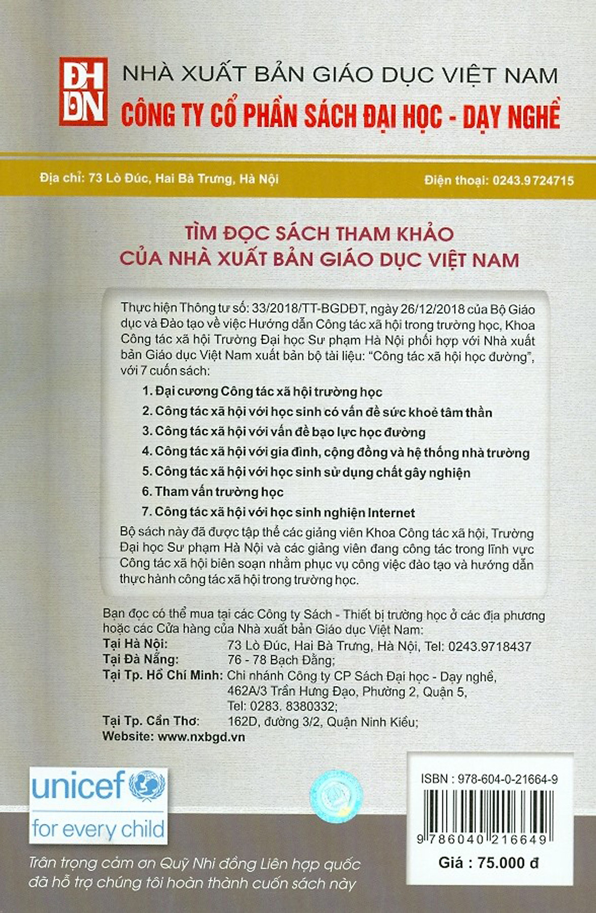 Mua tại TiktokCung cấp những kiến thức cơ bản về học sinh có vấn đề sức khoẻ tâm thần học đường; các chính sách, nguồn lực và dịch vụ trợ giúp học sinh có vấn đề sức khoẻ tâm thần. Trình bày khái quát về công tác xã hội, một số phương pháp của công tác xã hội với học sinh có vấn đề sức khoẻ tâm thần trong trường học; hướng dẫn các biện pháp chăm sóc sức khoẻ tâm thần cho một số nhóm đối tượng học sinh trong trường học.
