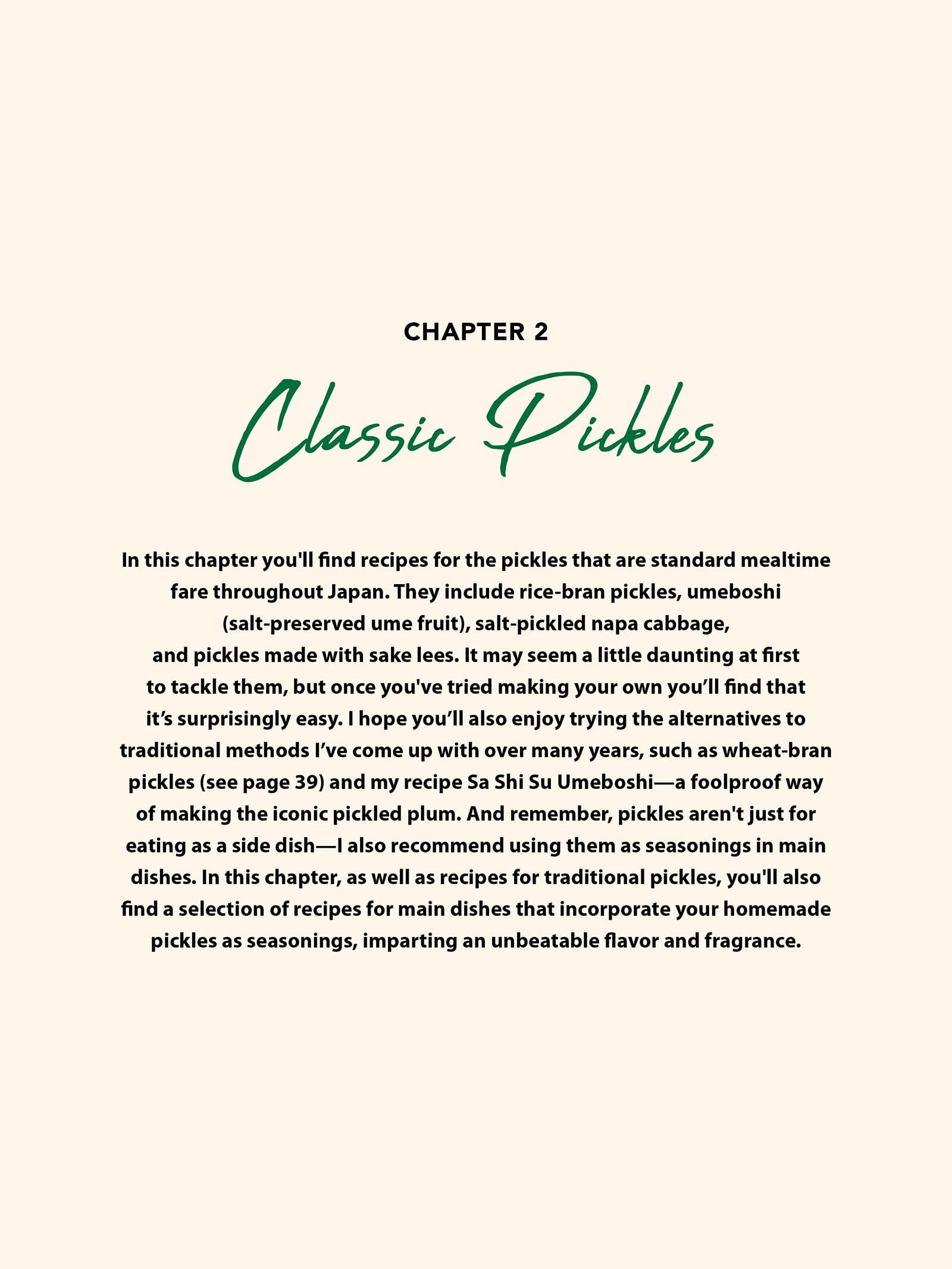 Chapter One: Quick pickles that are ready to eat immediately--like Spicy Eggplant Pickles, Cabbage and Garlic Pickled in Soy Sauce, and Tomatoes Seasoned in Sake Rice Wine Chapter Two: Classic Japanese pickling recipes--such as Umeboshi Preserved Plums, Napa Cabbage Kimchi, and Daikon Radish Pickled in Miso Chapter Three: Seasonal pickles--including Spring Parsley and Butterbur Pickles, Mixed Summer Vegetable Pickles and Winter Beets Pickled in Honey Yokoyama also presents recipes for meals that incorporate the pickles you make--like Sushi Rolls with Pickled Cabbage and Tofu Hotpot and Onion Salad with Fermented Soybean Dressing.