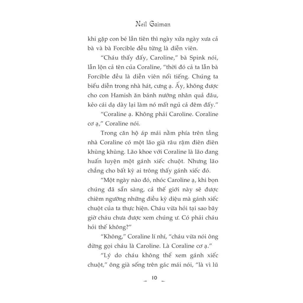 Tác giả: Neil GaimanDịch giả: Linh VũNhà xuất bản: Hội nhà vănSố trang: 218Ngày phát hành: 10-2023Khi Coraline bước qua cánh cửa, nó nhìn thấy một ngôi nhà giống hệt nhà mình. Chỉ có điều, mọi thứ dư...