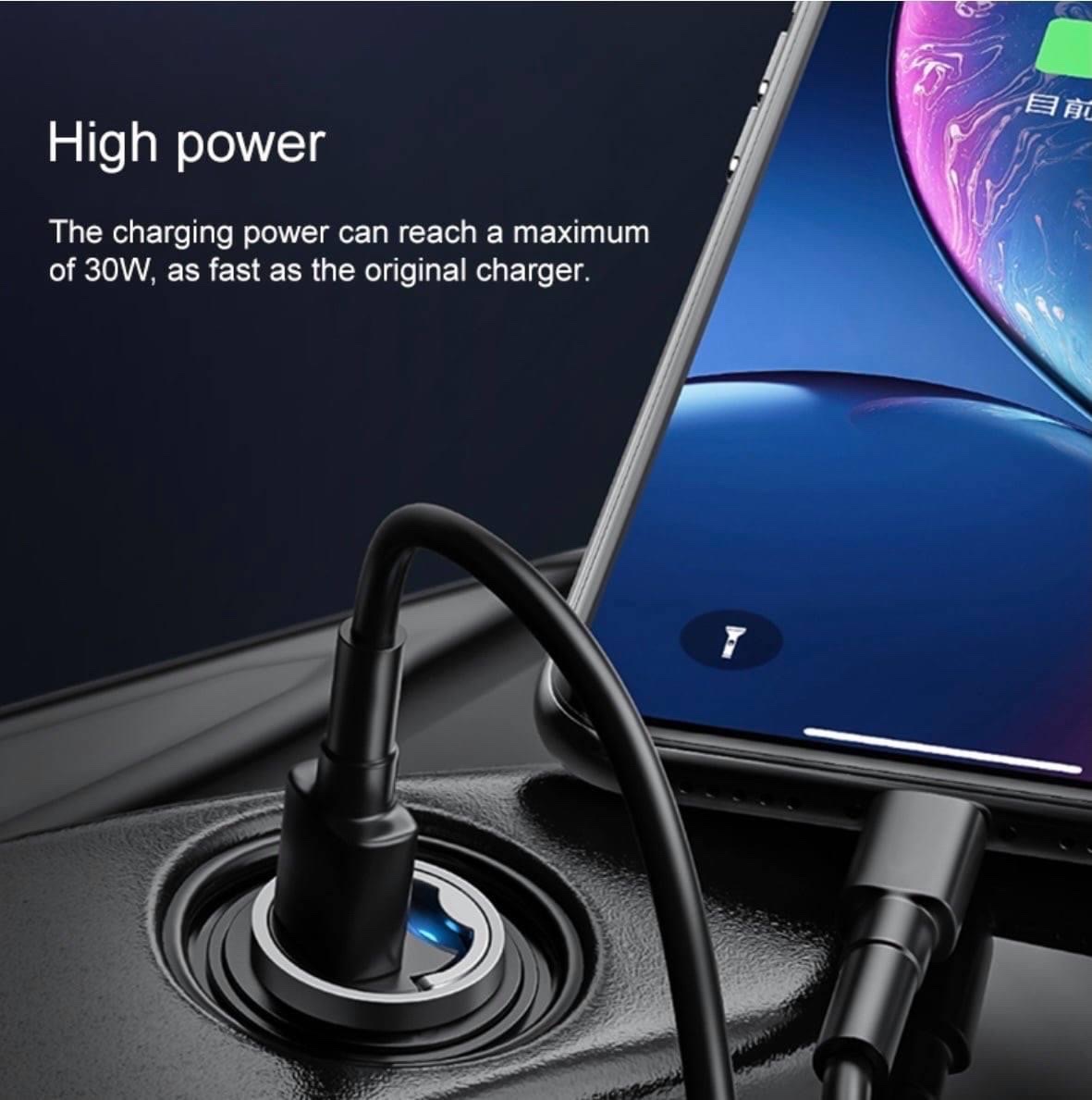 Giới thiệu Tẩu sạc dùng trên ô tô tích hợp cáp Type C và Light-ning Cable 60W Baseus Enjoyment Pro Car Charger - Thương hiệu: Baseus - Chất liệu: ABS+PC, TPE+Aluminium alloy - Input: DC 12-24V 7.0A Max.