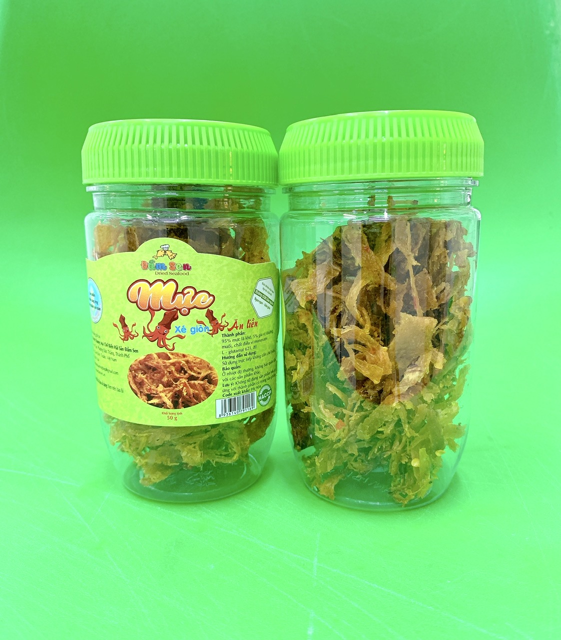 Thành phần: 90% Mực khô xé sợi, 10% gia vị (đường, muối, bột ngọt, ớt) Hạn sử dụng: 12 tháng kể từ ngày sản xuất Hướng dẫn sử dụng: Sử dụng trực tiếp không cần