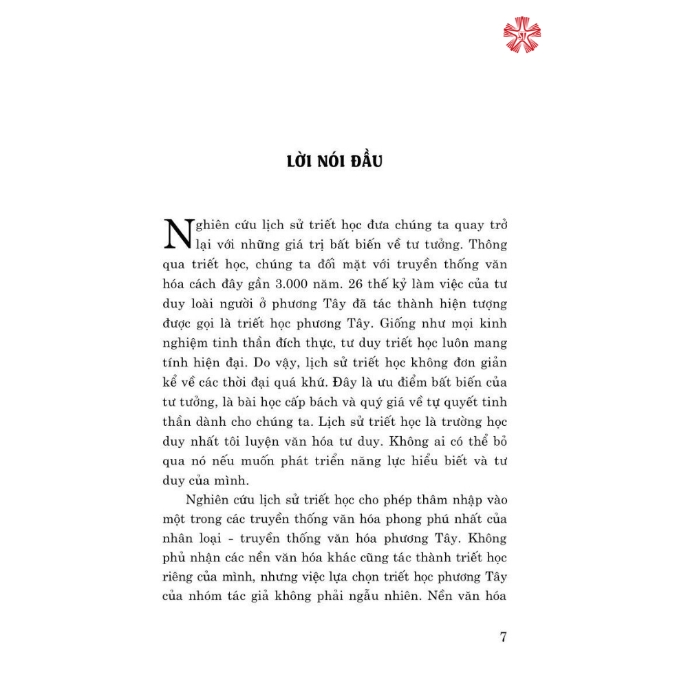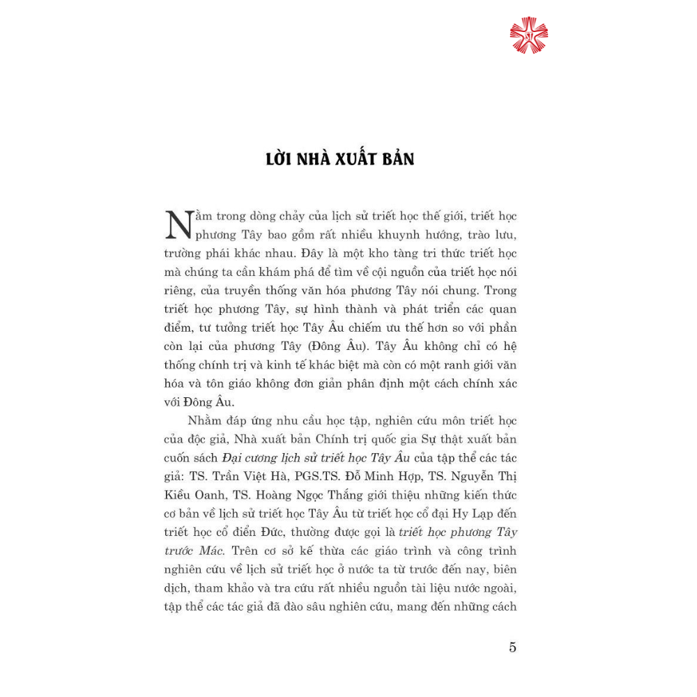 Mua tại TiktokCuốn sách đã trình bày một cách có hệ thống và chọn lọc nguồn gốc hình thành và quan điểm cơ bản của các trường phái triết gia phương Tây qua các thời kỳ lịch sử về các vấn đề bản thể luận, nhận thức luận, triết học đạo đức, triết học thẩm mỹ, triết học chính trị, triết học xã hội, , ảnh hưởng và sự kế thừa về tư tưởng giữa các triết gia, các trường phái, những đóng góp và hạn chế của họ; ý nghĩa của các quan điểm của họ đối với triết học trong các thời kỳ tiếp theo và thời đại ngày nay.