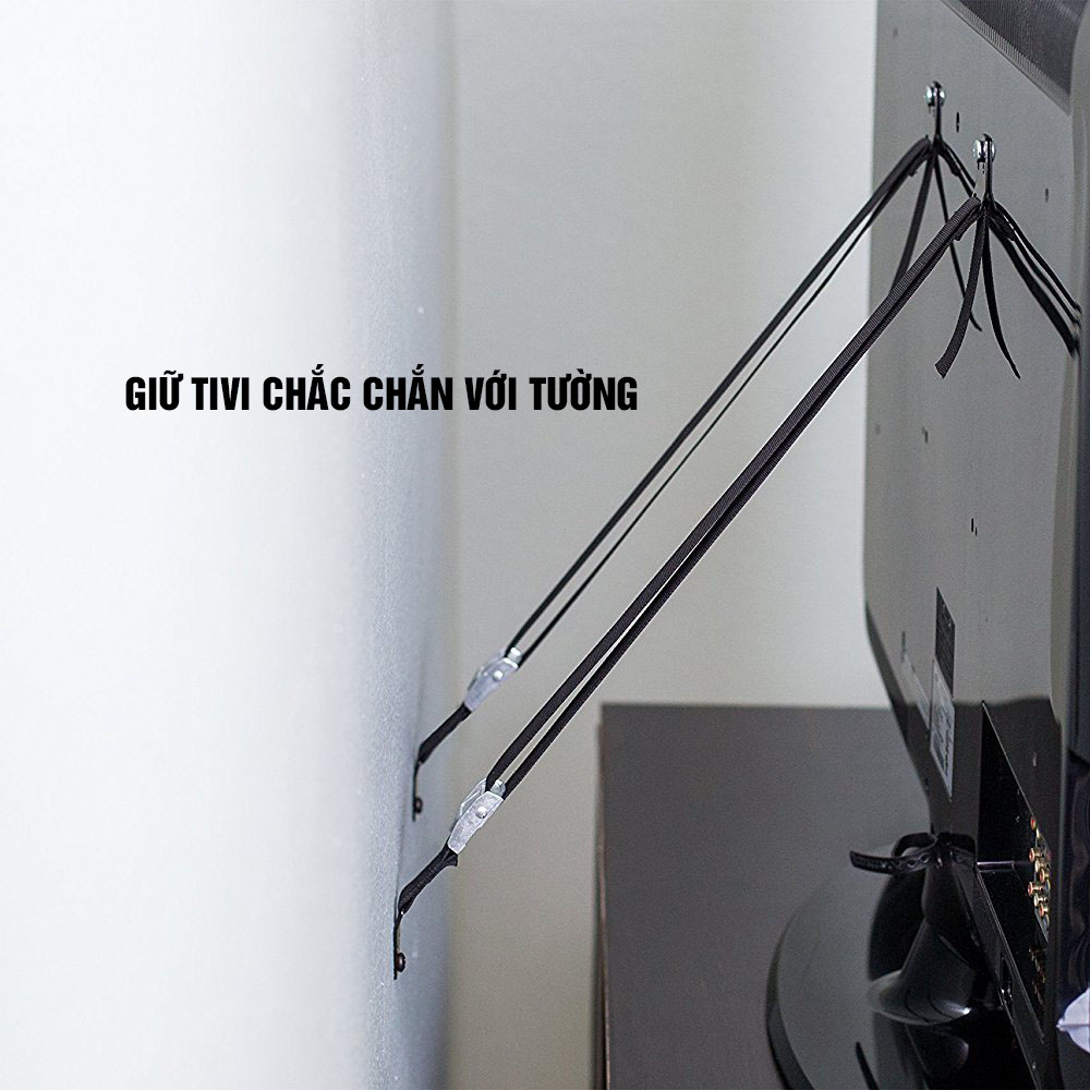 1 đầu bắt vào mặt sau Tivi, tủ…, đầu còn lại bắt vào tường, thành bàn. Sau khi đã cố định 2 đầu, rút ngắn dây và chốt lại.