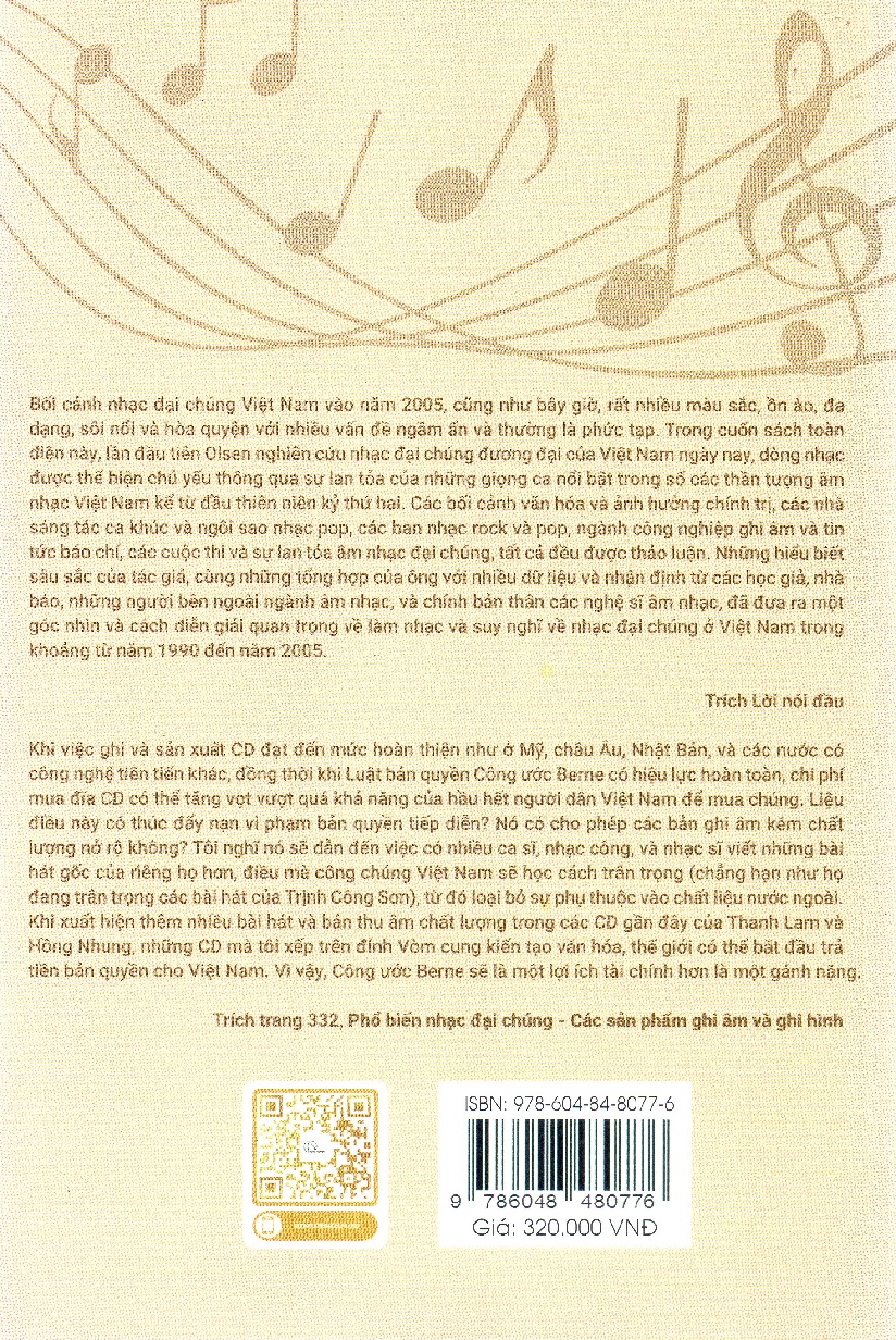 Cuốn sách “Nhạc Đại Chúng Việt Nam: Chuyển Đổi Xã Hội Giữa Hai Miền Nhớ Quên” của Dale A. Olsen là một nghiên cứu sâu sắc về sự phát triển của nhạc đại chúng Việt Nam trong bối cảnh xã hội, chính trị và văn hóa từ cuối thế kỷ 20 đến đầu thế kỷ 21. Tác phẩm khám phá mối quan hệ phức tạp giữa âm nhạc và các chuyển đổi xã hội, từ ảnh hưởng của quá trình toàn cầu hóa đến những thay đổi trong đời sống hàng ngày của người dân Việt Nam. Thông qua việc phân tích các ngôi sao nhạc pop, các ban nhạc rock và pop, cũng như những sự kiện âm nhạc lớn và văn hóa karaoke, cuốn sách mang đến cái nhìn toàn diện và phong phú về vai trò của nhạc đại chúng trong việc phản ánh và định hình xã hội Việt Nam đương đại. Đây là một tài liệu quý giá cho những ai quan tâm đến âm nhạc, văn hóa và lịch sử Việt Nam.