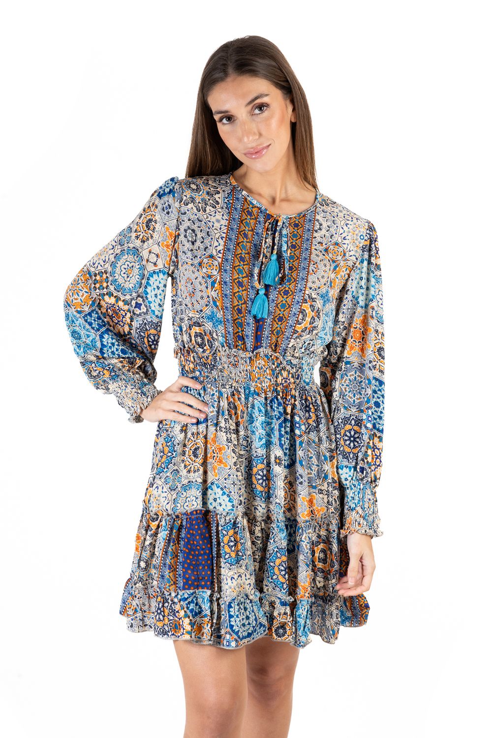 Mua tại TiktokĐầm Boho Dài Tay Isla Bonita, chất lụa cao cấp, mềm mại, thun co giãn ở eo. Phom suông xòe rộng. Dài đầm 90cm (45x90)